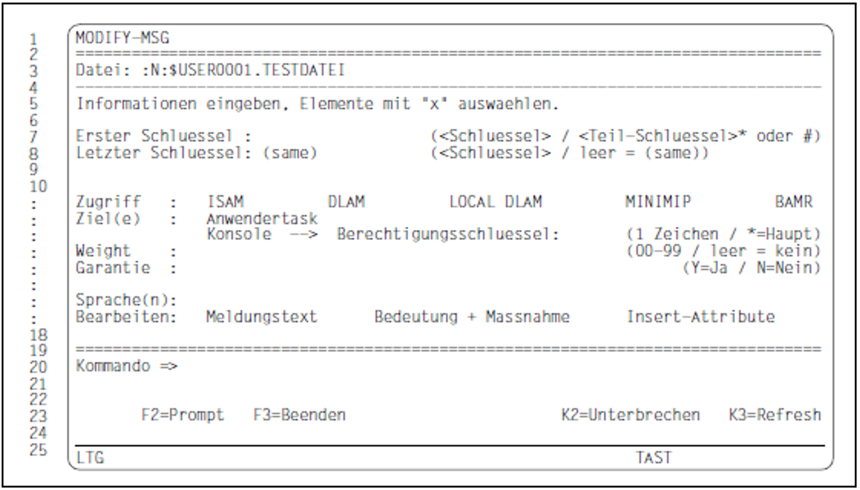 Der in die Hauptmaske MENU eingetragene Name wird in die Maske MODIFY-MSG übernommen. Der Name kann nicht verändert werden.