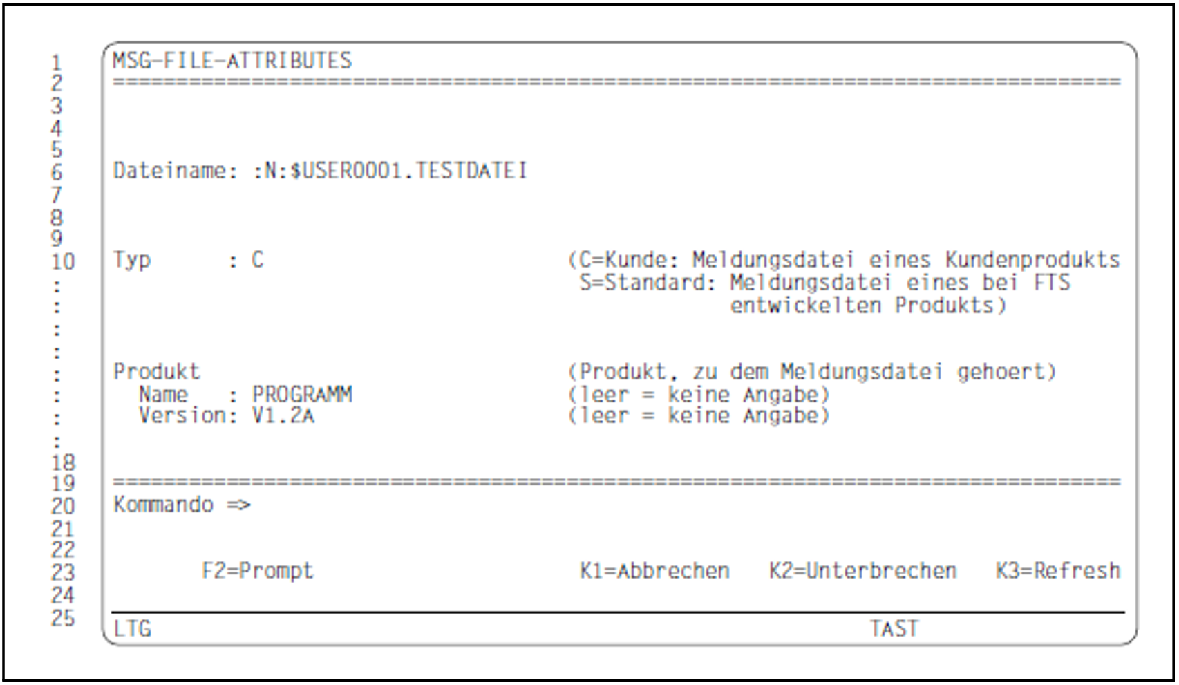 Ein Wechsel in die Maske MSG-FILE-ATTRIBUTES erfolgt, wenn in der Maske MENU Folgendes angegeben wird:
