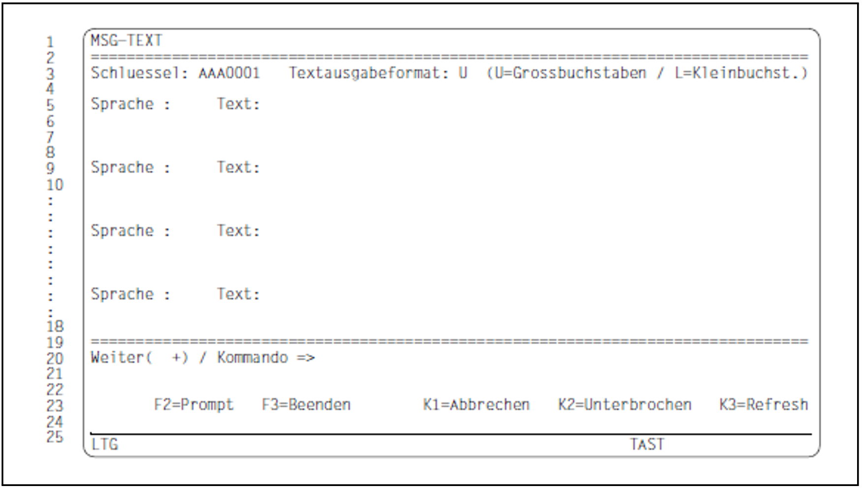 Der in den Masken ADD-MSG oder MODIFY-MSG eingetragene Meldungsschlüssel wird in die Maske MSG-TEXT übertragen und kann nicht verändert werden.