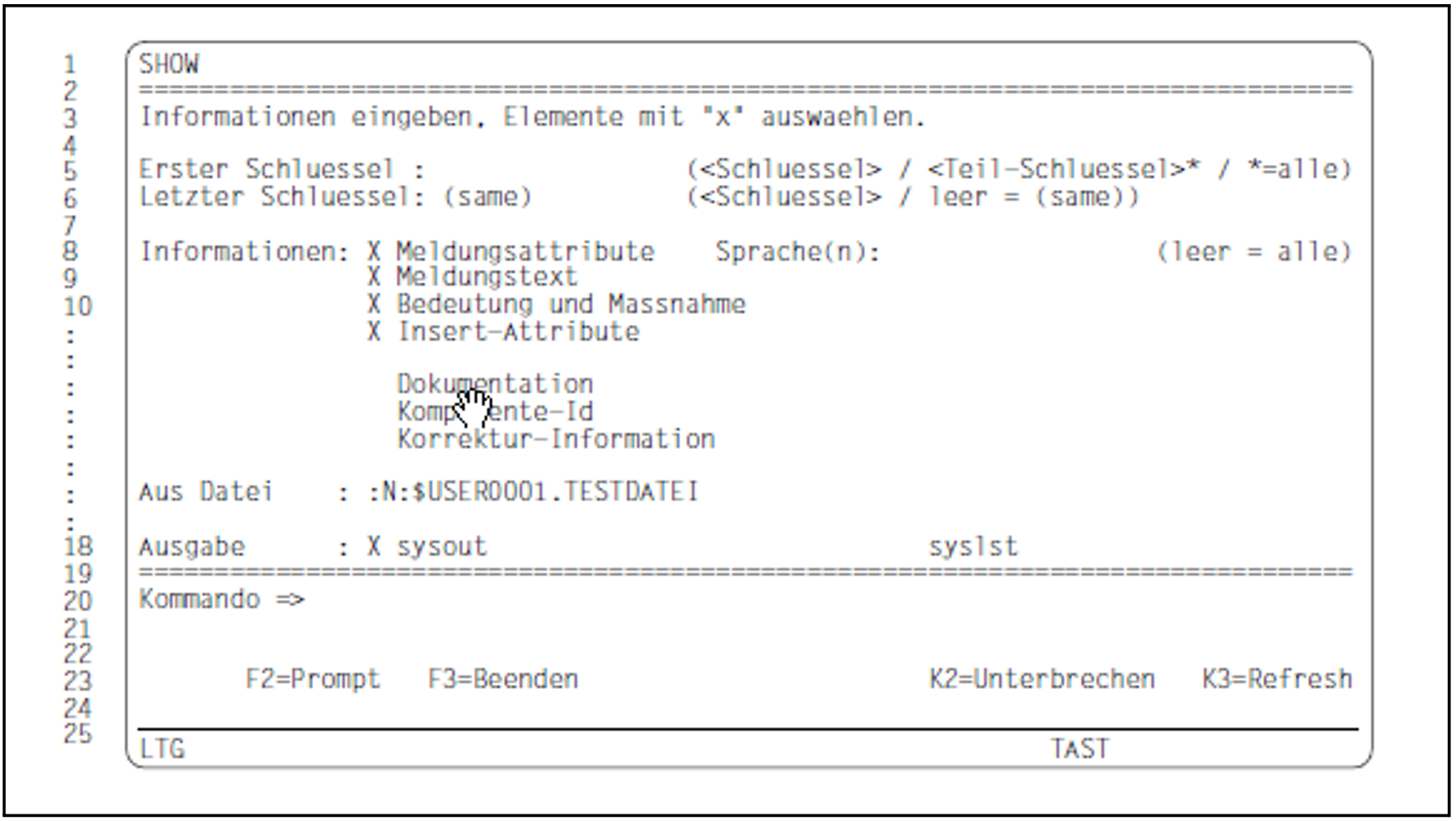 Die ausgewählten Bestandteile der Meldungsdatei werden in die Systemdatei SYSLST ausgegeben. Der Text wird mit 60 Zeilen pro Seite ausgegeben.
