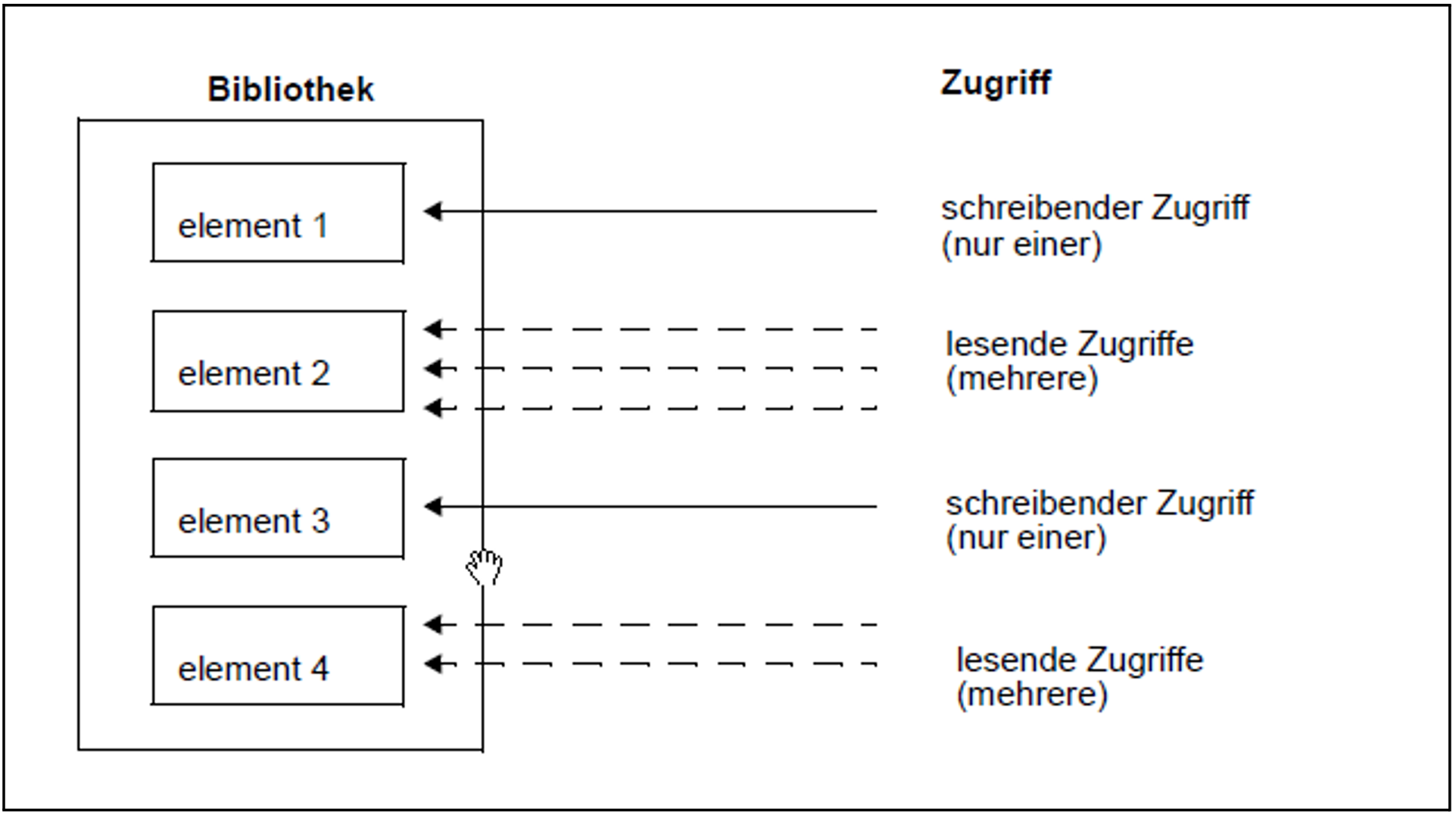 Ein Element kann gleichzeitig von mehreren Benutzern gelesen, jedoch nur von einem geschrieben werden. Während das Element zum Schreiben eröffnet ist, kann kein anderer Zugriff - auch kein lesender - auf dieses Element erfolgen, jedoch auf andere Elemente der Bibliothek.