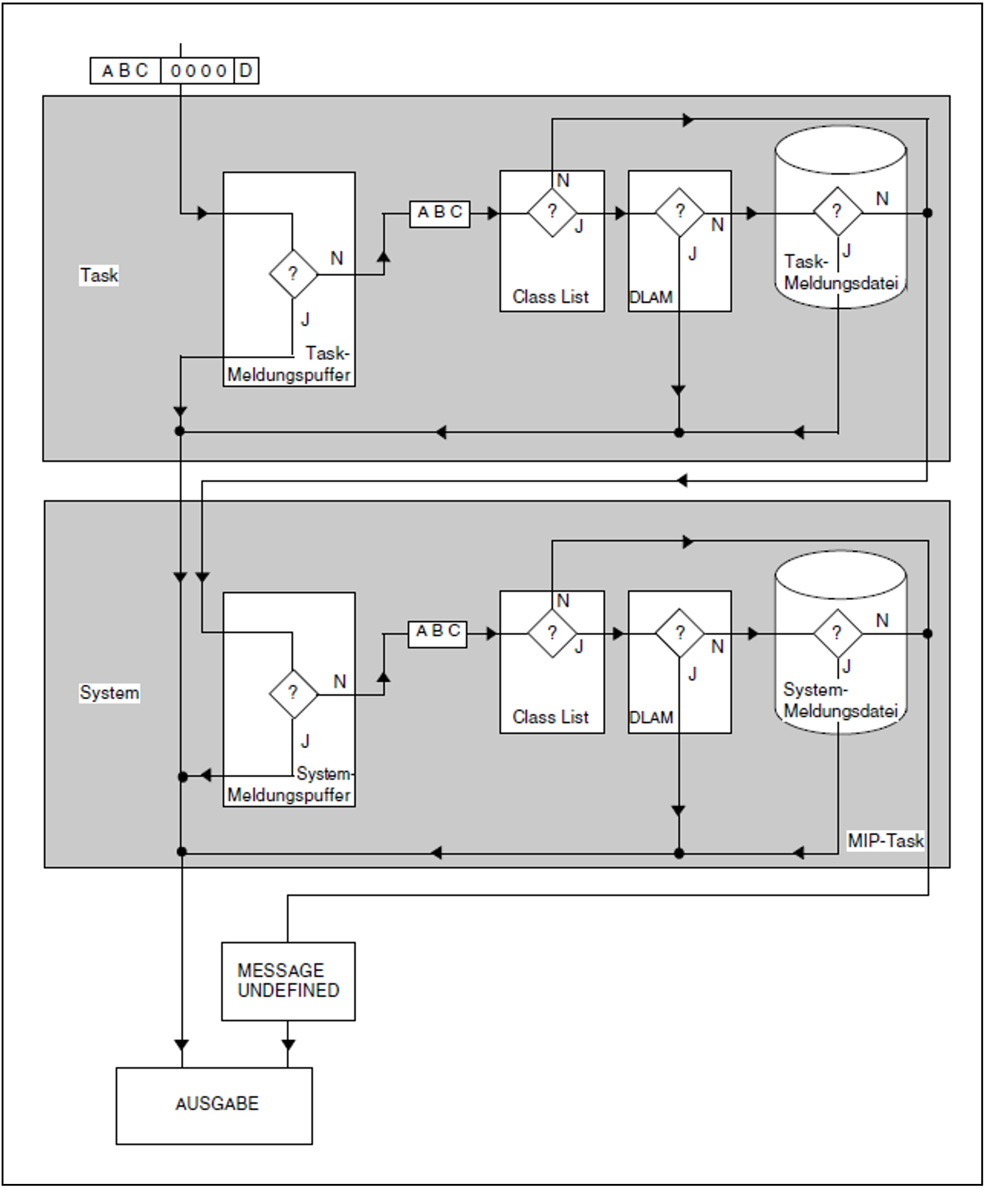 Ist die Meldung in keiner task-eigenen Meldungsdatei zu finden, wird der Suchvorgang auf Systemebene im systemeigenen Meldungspuffer fortgesetzt. Entspricht auch hier keine Meldung den Vorgaben, wird die MIP-Task aufgerufen, um mit der Meldungssuche in den Systemmeldungsdateien fortzufahren. Auch hier wird, analog zur Task-Ebene, zuerst der DLAM-Bereich überprüft, bevor die Meldungsdateien durchsucht werden.
