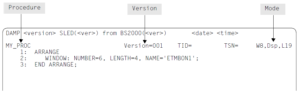 Dieses Beispiel soll veranschaulichen, wie es mit den Standardprozeduren DUMP_MEMORY und SET_HEADER möglich ist, beliebige Speicherbereiche auf SYSLST auszugeben: