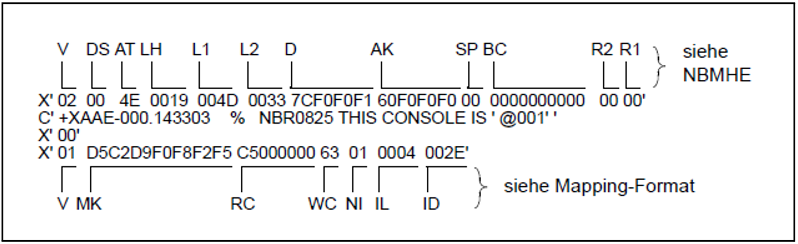 Der Text dieser Nachrichten hat grundsätzlich das gleiche Format wie bei Ein-/Ausgaben an physikalischen Konsolen (siehe voriges Kapitel). Zusätzliche Formate ergeben sich ausschließlich, wenn das berechtigte Benutzerprogramm als Server eines Operator-Spezialkommandos fungiert. Diese Erweiterungen sind in ab "Operator-Spezialkommandos in berechtigten Benutzerprogrammen" beschrieben.