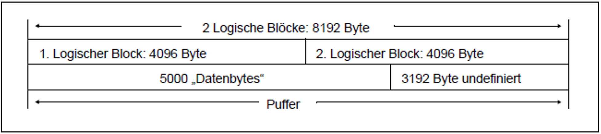 Für eine Datei mit BLKCTRL=NO und BLKSIZE=(STD,2) werden in einem PAM-Aufruf die Operanden WRT und LEN=5000 angegeben. Aus dem Puffer werden 5000 Byte übernommen, der Rest bis zum nächstgrößeren ganzzahligen Vielfachen der Logischen Blockgröße (8192 Byte) ist undefiniert.