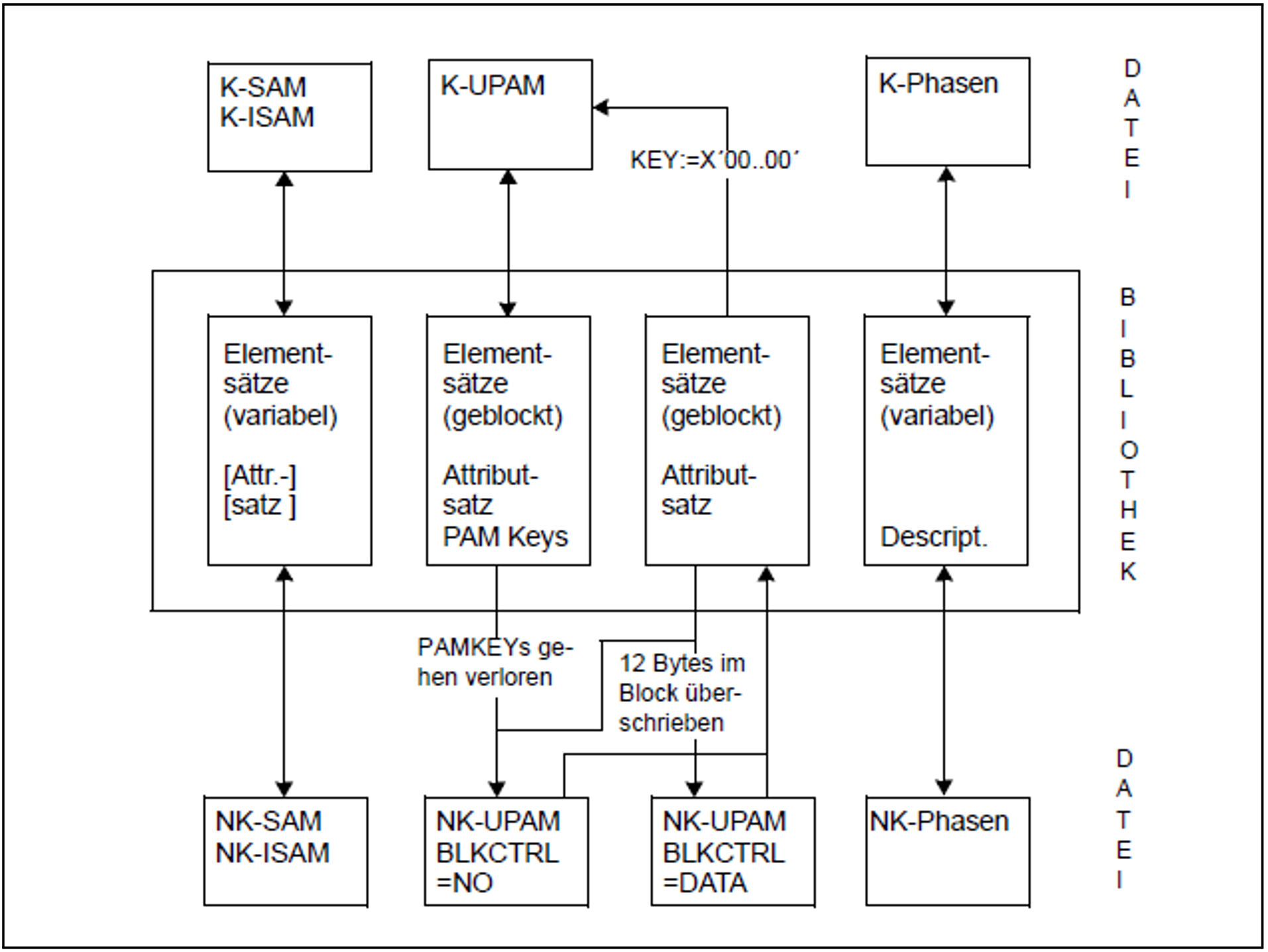 Das nachfolgende Bild zeigt einen Überblick über die möglichen Situationen beim Transfer von Daten zwischen Datei und Bibliothekselementen. Für die Elemente sind die logischen Informationseinheiten aufgeführt; für die Dateien ist der BLKCTRL-Wert angegeben. Die Pfeile beschreiben die Transfer-Richtung.