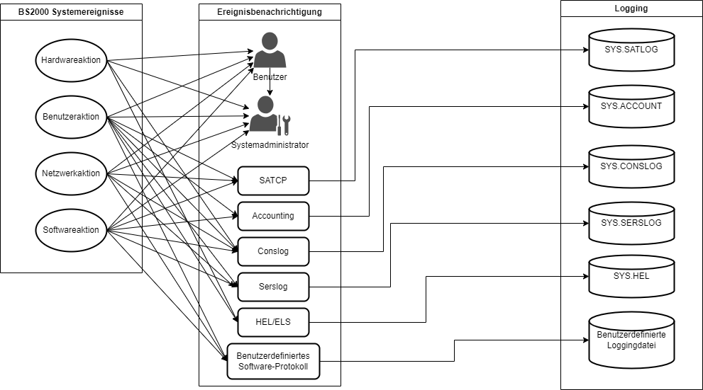 Die nachstehende Abbildung stellt die typische Protokollierung des Informationsflusses im Betriebssystem BS2000 dar, die für eine Auswertung in Frage kommen: