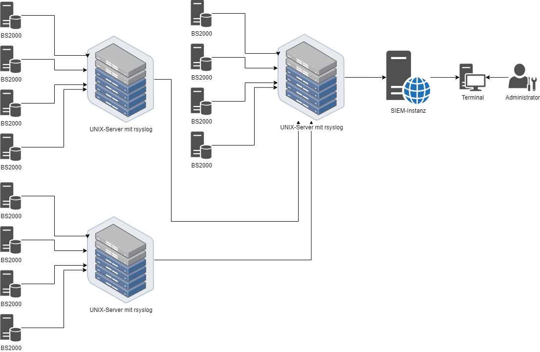 Im folgenden dargestellten möglichen Szenario werden als Beispiel rSyslog-Server verwendet. Diese empfangen und speichern die Ereignisse für jeweils mehrere BS2000-Systeme. Die rSyslog-Server selber können auch kaskadieren, also die Ereignisse auch an einen zentralen rSyslog-Server weiterleiten, der wiederum alle Ereignisse sammelt, um sie im Anschluss z.B. an eine SIEM-Instanz zur Auswertung zu senden. Das in diesem Beispiel dargestellte Szenario verdeutlicht die Skalierbarkeit der Infrastruktur.