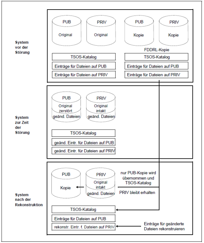 Die private Platte ist mit dem Dienstprogramm VOLIN zu initialisieren (siehe Handbuch „Dienstprogramme“ [15]). Bei der Rekonstruktion durch FDDRL ist die Sicherung vom Band einzuspielen. Je nach Stand dieser physikalischen Sicherung kann noch das Einlesen logischer Sicherungen nötig sein, um den aktuellen Stand wieder herzustellen.