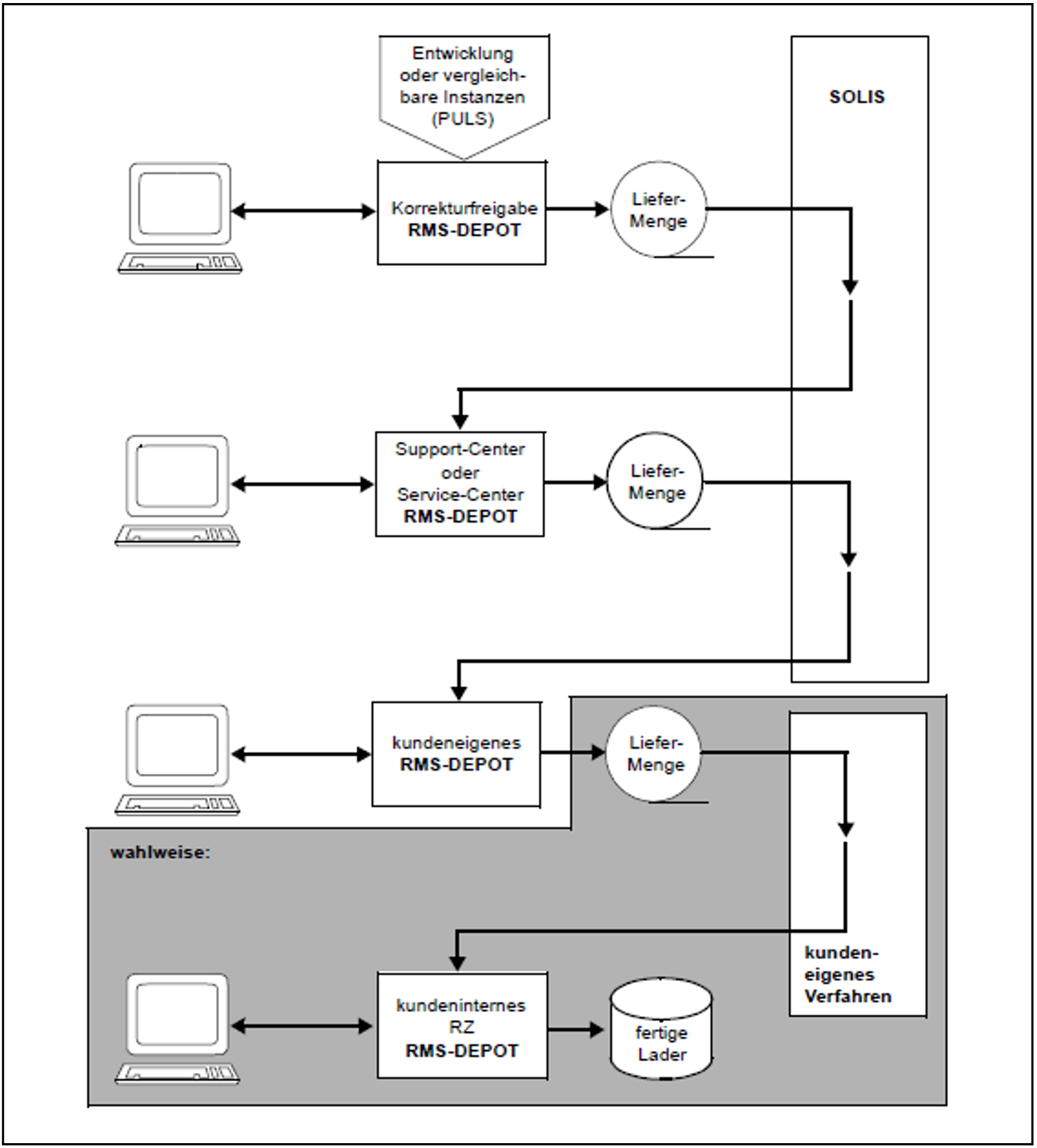 versionsspezifisch Rep-Korrekturen, Kommentare zu diesen Korrekturen, Status (aktiv, nicht aktiviert) usw. eingetragen. Die neu eingefahrene RMS-Liefermenge kann über RMS im Depot weiter bearbeitet werden, z.B. durch eigene, weitere (Rep-)Korrekturen ergänzt werden oder es können (Rep)-Korrekturen aktiviert, deaktiviert oder mit Kommentaren versehen werden.Aus dem Depot kann nun entweder wiederum eine RMS-Liefermenge erzeugt werden, um sie an eine nächste Anwendergruppe zu übergeben. Die Übergabe erfolgt über SOLIS oder kundeneigene Verfahren. Die nächste Anwendergruppe bringt dann mittels RMS diese RMS-Liefermenge in ihr Depot ein und bearbeitet sie ggf. weiter.
