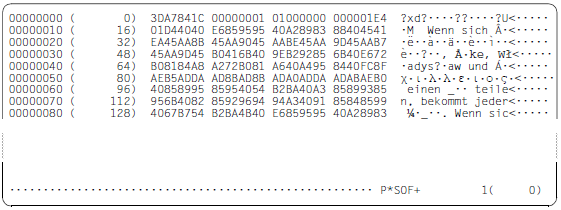 Passt die Hexadezimal-Darstellung eines Satzes nicht mehr vollständig in das Datenfenster, wird dieser Satz und evtl. weitere Sätze in den verbleibenden Zeilen nur im Character-Format dargestellt und erst beim Weiterpositionieren aufbereitet.