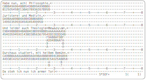Für Unicode-Dateien reichen zwei Hex-Zeilen zur Darstellung meist nicht mehr aus. Bei UTF16 sind zwei Zeilenpaare, bei UTF8 bis zu drei Zeilenpaare und bei UTFE sogar bis zu vier Zeilenpaare für die Hex-Darstellung erforderlich. Allerdings reicht bei UTF8 und UTFE im Normalfall ein Zeilenpaar aus, da die Zeichen variabel lang codiert werden, und nur für besondere Zeichen (etwa Umlaute, das „ß“ oder das Euro-Zeichen) mehr Zeilenpaare gebraucht werden.Nach einem aufbereiteten Satz wird ein Zeilenlineal als optischer Trenner zum nächsten Satz eingefügt.
