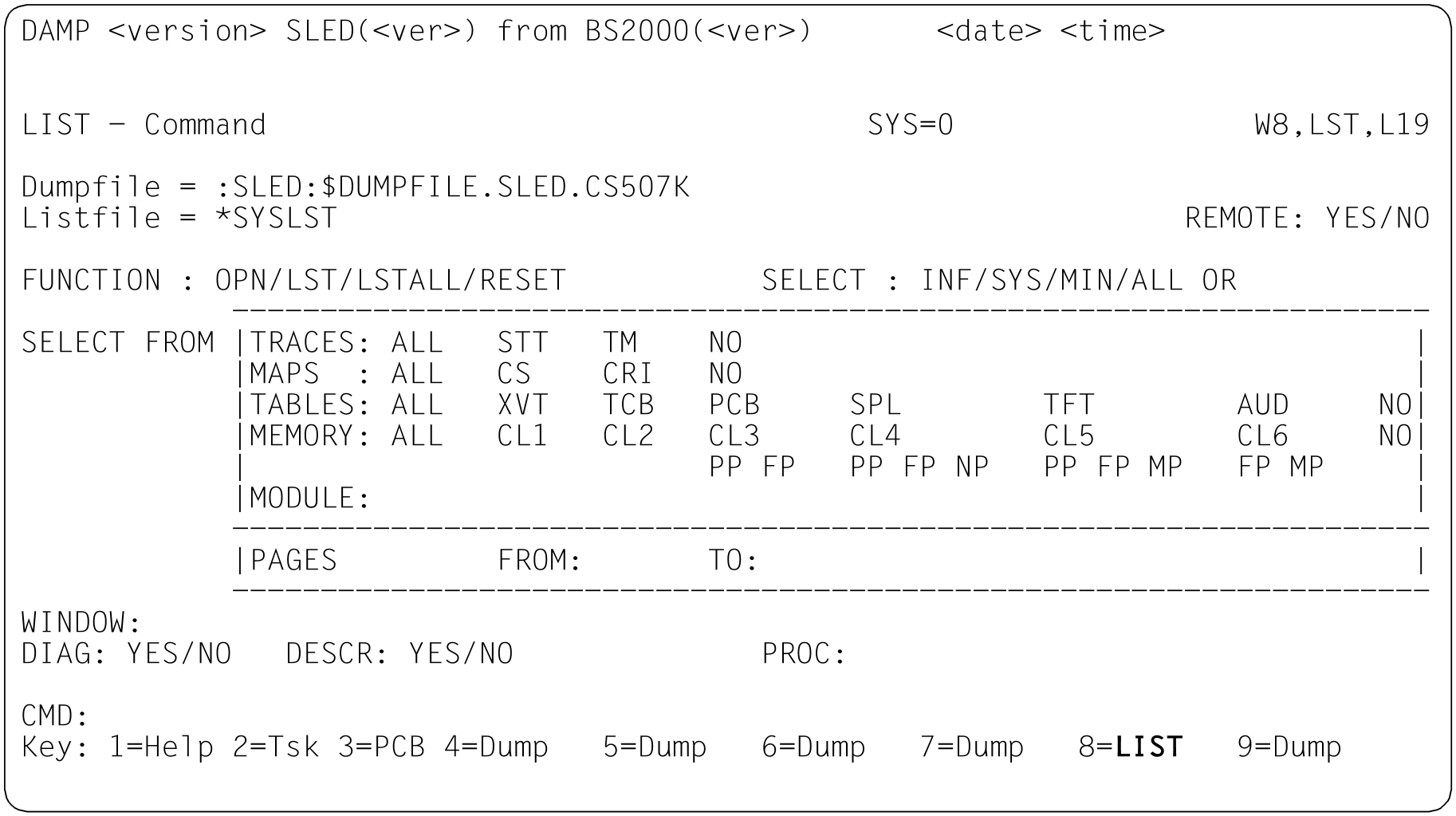 Nach dem Eingeben der Anweisung START-LIST-GENERATION erscheint die List-Maske im letzten freien Diagnosefenster. War schon eine Dumpdatei geöffnet, so ist das Feld Dumpfile mit dem Namen der geöffneten Datei vorbesetzt. War keine Dumpdatei geöffnet oder soll eine andere als die geöffnete Datei für den Druck aufbereitet werden, ist zunächst eine Datei auszuwählen (siehe "Datei auswählen"). Umfang und Inhalt der zu druckenden Liste wird anschließend durch das Markieren bzw. Ausfüllen der verschiedenen Felder der Maske bestimmt. Bei der Bearbeitung eines Areadumps ist die Angabe von Auswahlkriterien wirkungslos, da nur die zum Areadump gehörenden Standardtabellen und die angeforderten Bereiche aufbereitet werden.