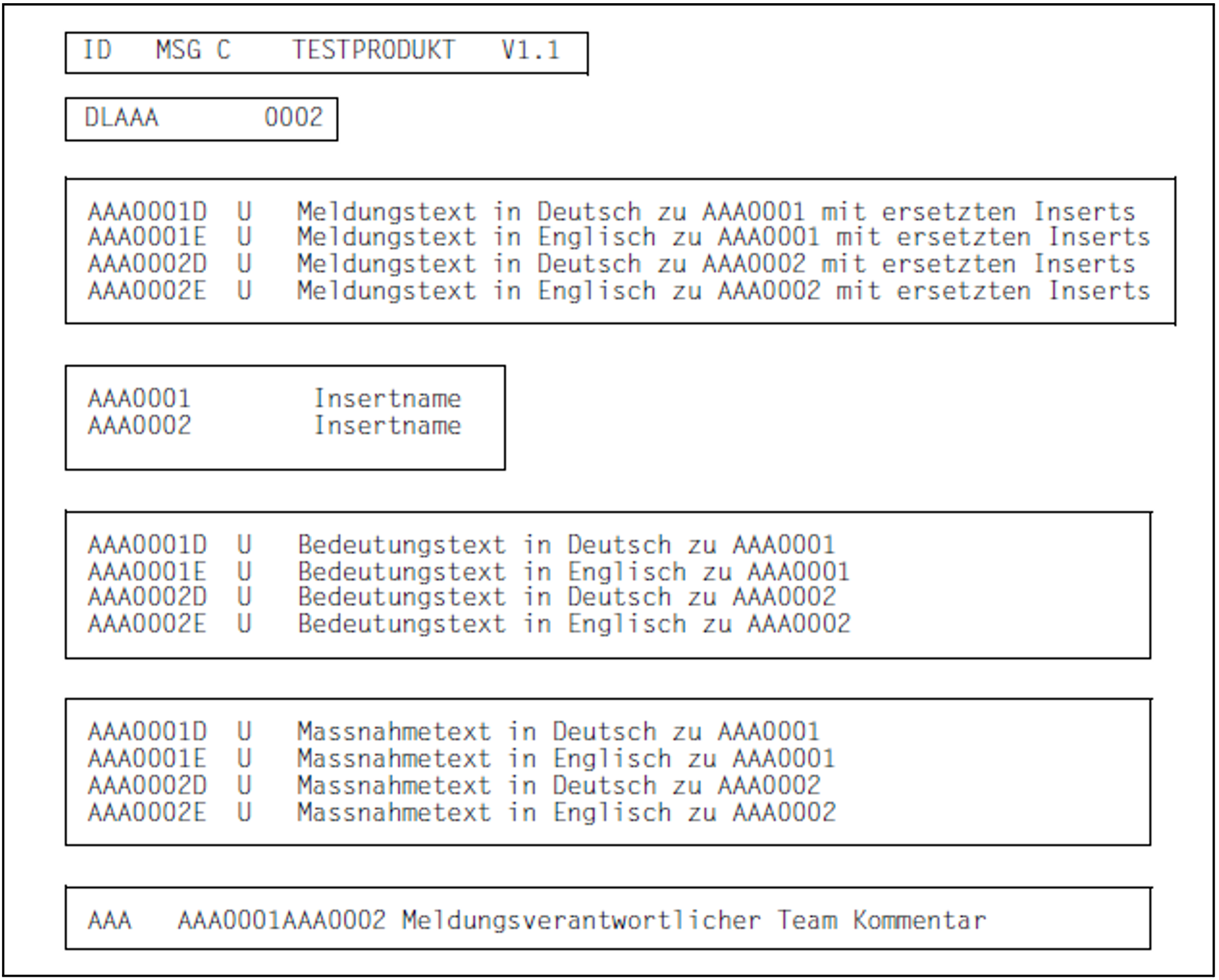 Jede mit dem Dienstprogramm MSGMAKER erstellte Meldungsdatei setzt sich aus einzelnen Meldungseinheiten zusammen, auf die über einen siebenstelligen Meldungsschlüssel zugegriffen wird. Die Meldungseinheit besteht aus Meldungsattributen, Meldungstext und ggf., um ein in der Meldung zitiertes Problem näher zu erläutern und mögliche Maßnahmen aufzuzeigen, einem Bedeutungs- und Maßnahmetext. Alle Texte können in maximal acht Sprachen eingetragen werden. Jede Sprache wird durch ein einstelliges Buchstabenkürzel, dem Kennbuchstaben für die Sprache, dargestellt.