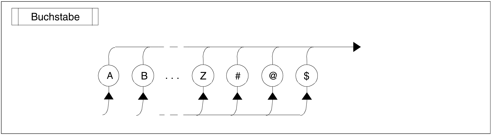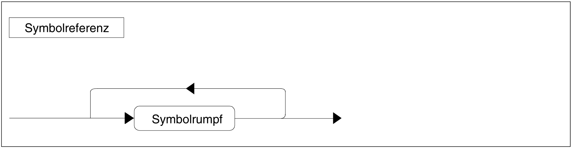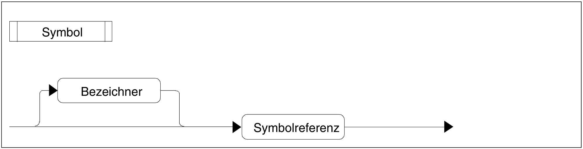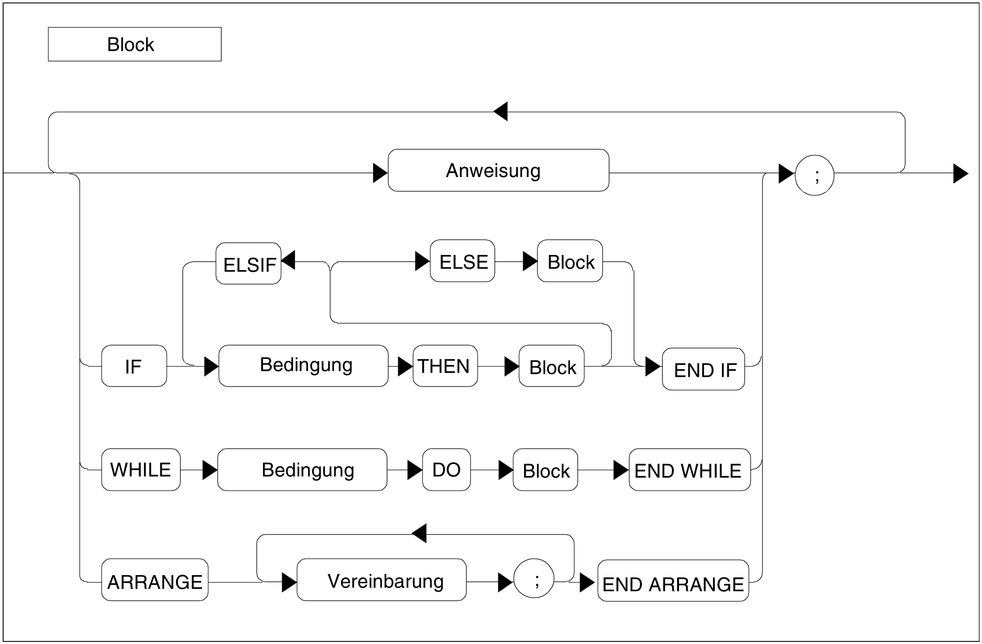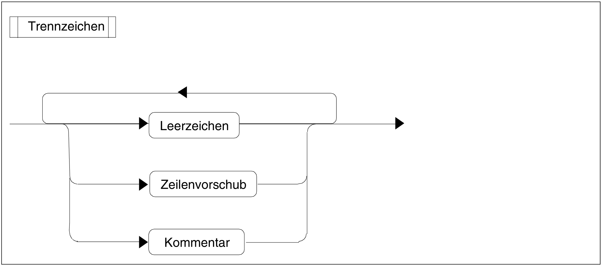 Um eine zu umfangreiche Darstellung der Diagramme zu vermeiden, gilt Folgendes: Verbindungslinien zwischen den Kartuschen repräsentieren ein Trennzeichen (siehe "Lexikalische Elemente"). Nur vor und nach einem Sonderzeichen darf das Trennzeichen weggelassen werden. In Diagrammen, deren Kopf mit Doppel-Linien umrahmt ist, dürfen keine Trennzeichen gesetzt werden.