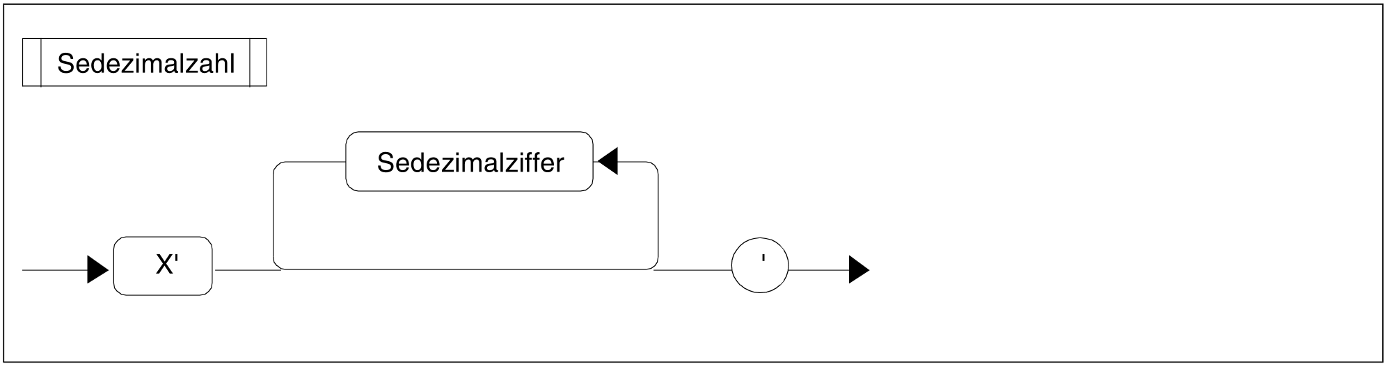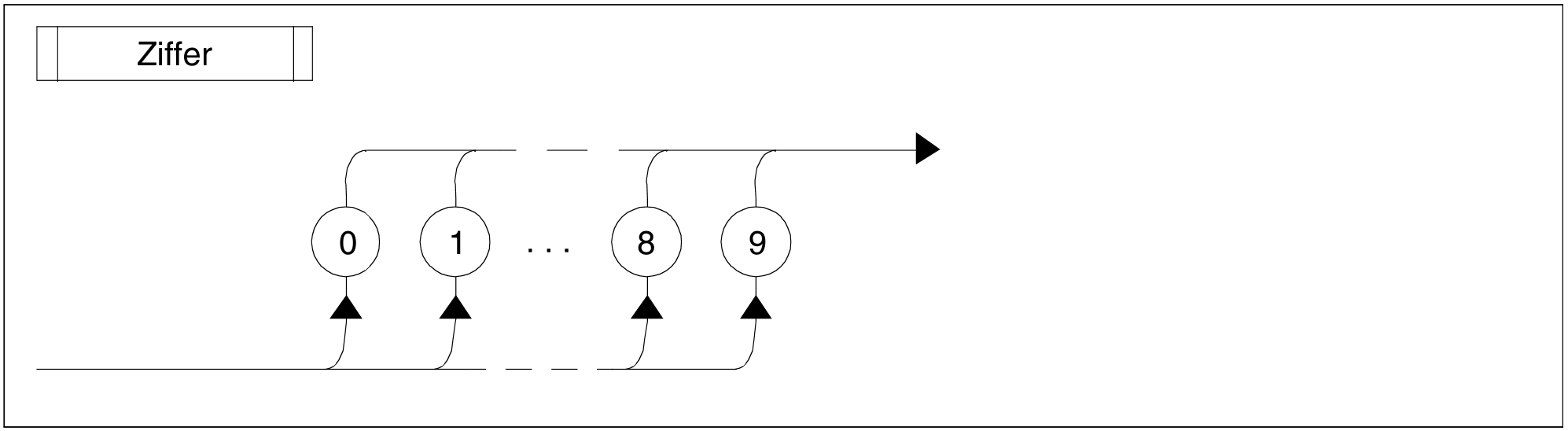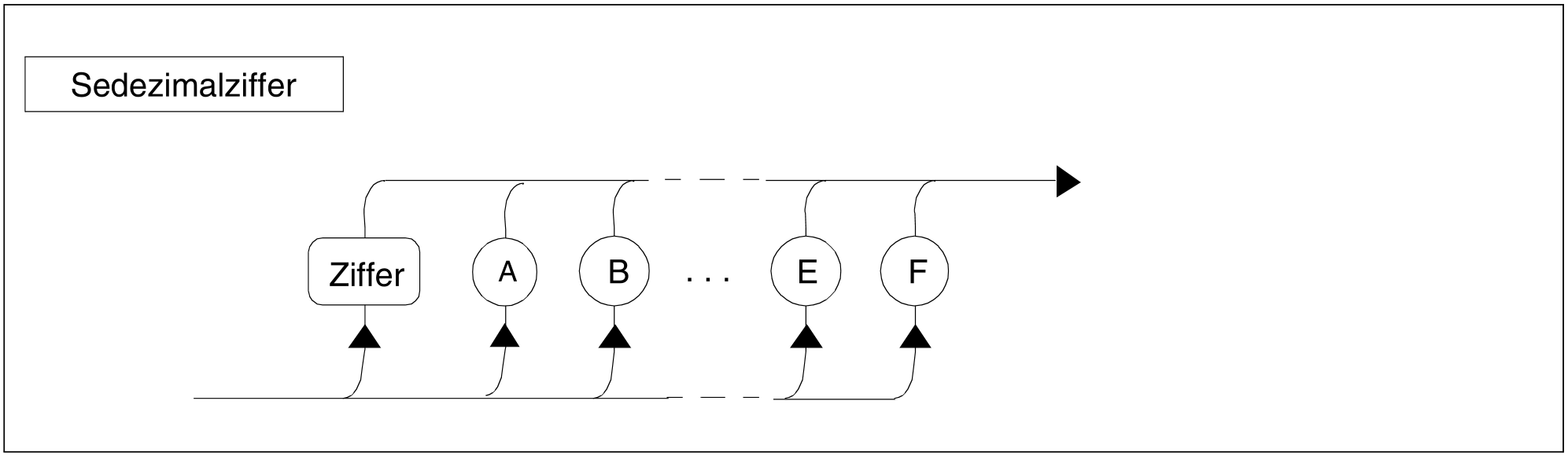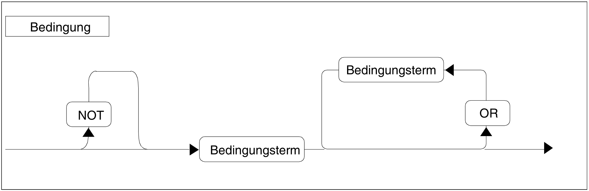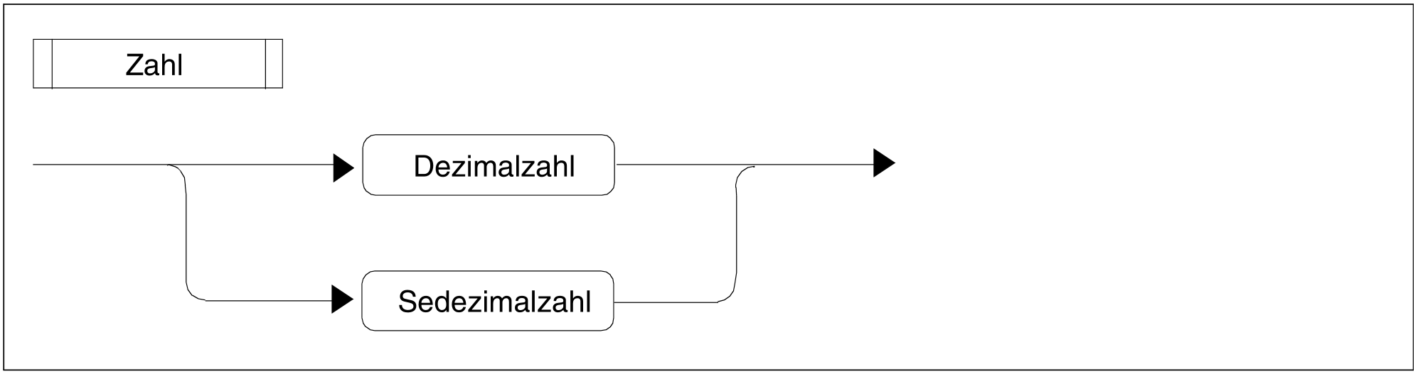 Um eine zu umfangreiche Darstellung der Diagramme zu vermeiden, gilt Folgendes: Verbindungslinien zwischen den Kartuschen repräsentieren ein Trennzeichen (siehe "Lexikalische Elemente"). Nur vor und nach einem Sonderzeichen darf das Trennzeichen weggelassen werden. In Diagrammen, deren Kopf mit Doppel-Linien umrahmt ist, dürfen keine Trennzeichen gesetzt werden.