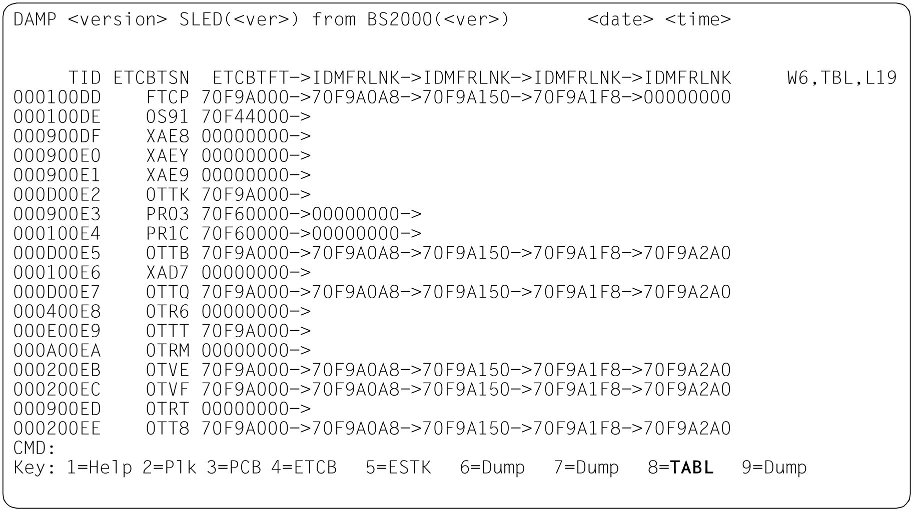 Anschließend können Sie in die Kopfzeile eine Liste von Feldnamen der taskspezifischen DSECTs ETCB, EJCB und EVUMT, getrennt durch Leerzeichen, eingeben. Die nachfolgende Ausgabe besteht dann in je einer Zeile pro Task mit den Inhalten dieser Felder.