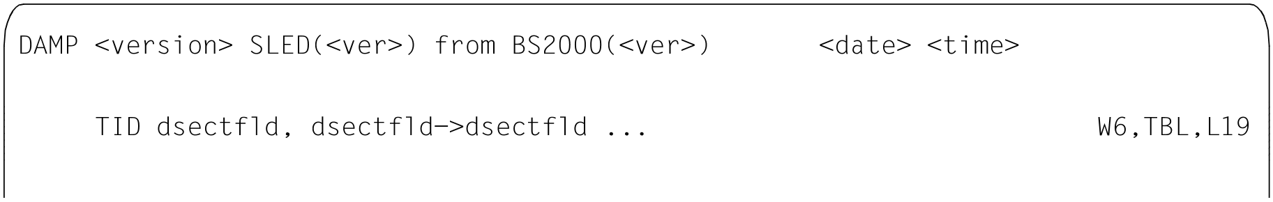 Das Ausgabeformat der Felder entspricht ihrer Definition in der DSECT. Es kann jedoch durch explizite Angabe eines Formatzeichens in Klammern hinter dem Feldnamen geändert werden. Akzeptiert werden die Formatzeichen