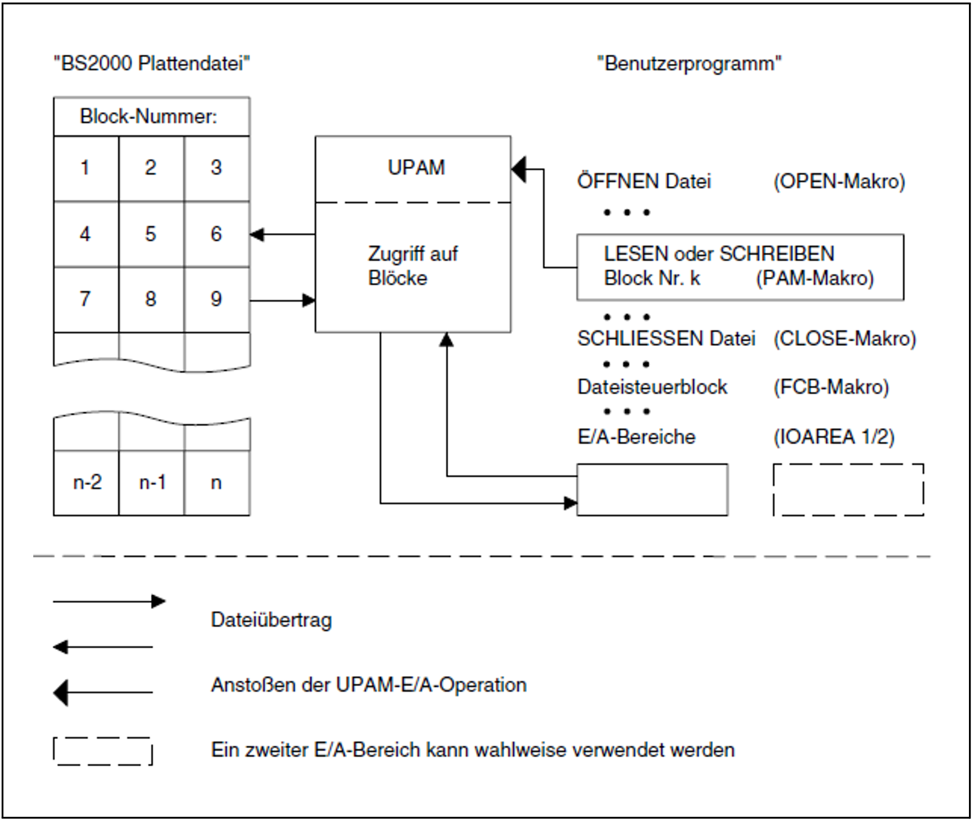 UPAM ist die primäre blockorientierte Zugriffsmethode im BS2000 für wahlfreien Zugriff auf Plattendateien. Zu jedem Zeitpunkt kann auf einen beliebigen Block der Datei lesend oder schreibend zugegriffen werden.