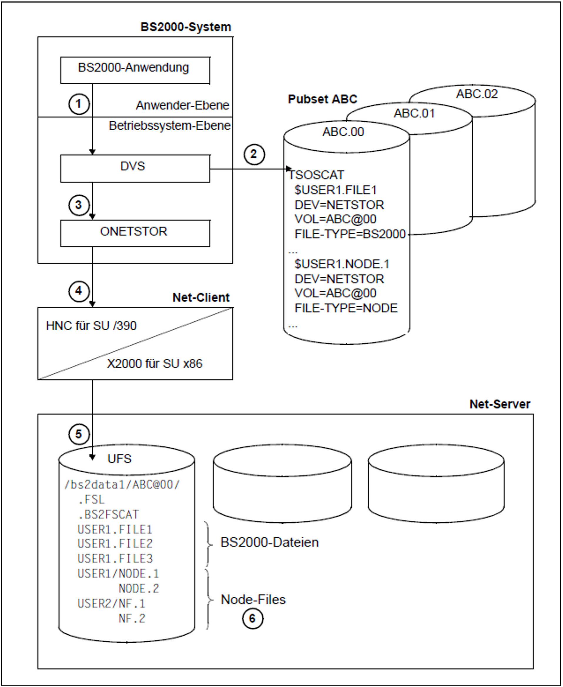 Das BS2000-Subsystem ONETSTOR transformiert den BS2000-Dateizugriff in den entsprechenden Dateizugriff im UNIX-Dateisystem (UFS) und reicht ihn an den Net-Client weiter.