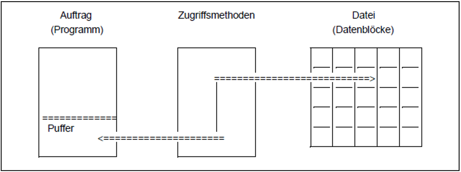 Beim Zugriff eines Benutzerprogramms auf den Inhalt einer Datei lassen sich satz- und blockorientierter Zugriff unterscheiden sowie die Betriebsarten Übertragungsbetrieb und Ortungsbetrieb.