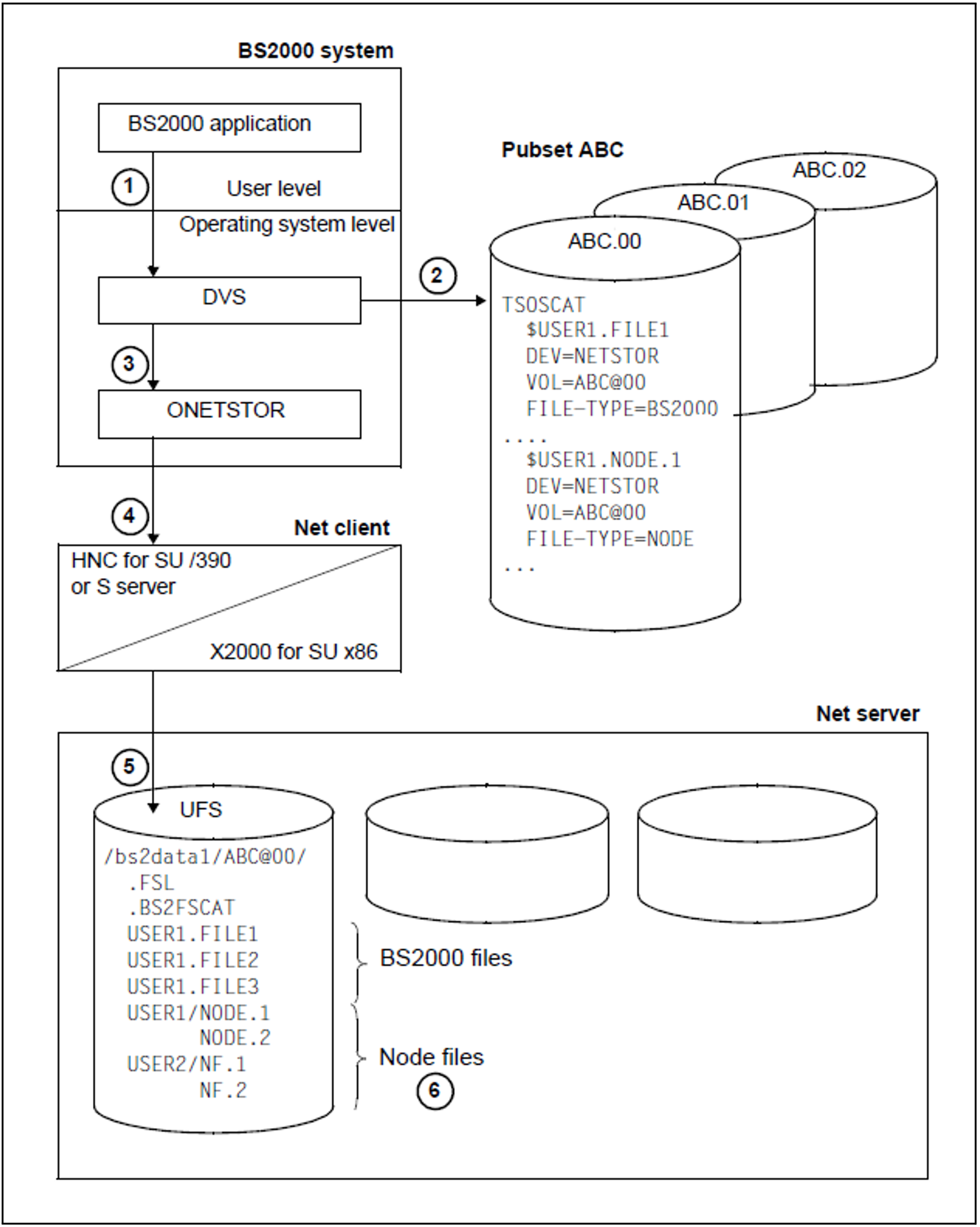 FILE1file is actually accessed via the BS2000 subsystem ONETSTOR and the net client.The BS2000 subsystem ONETSTOR transforms the BS2000 file access to the corresponding file access in the UNIX file system (UFS) and forwards it to the net client.