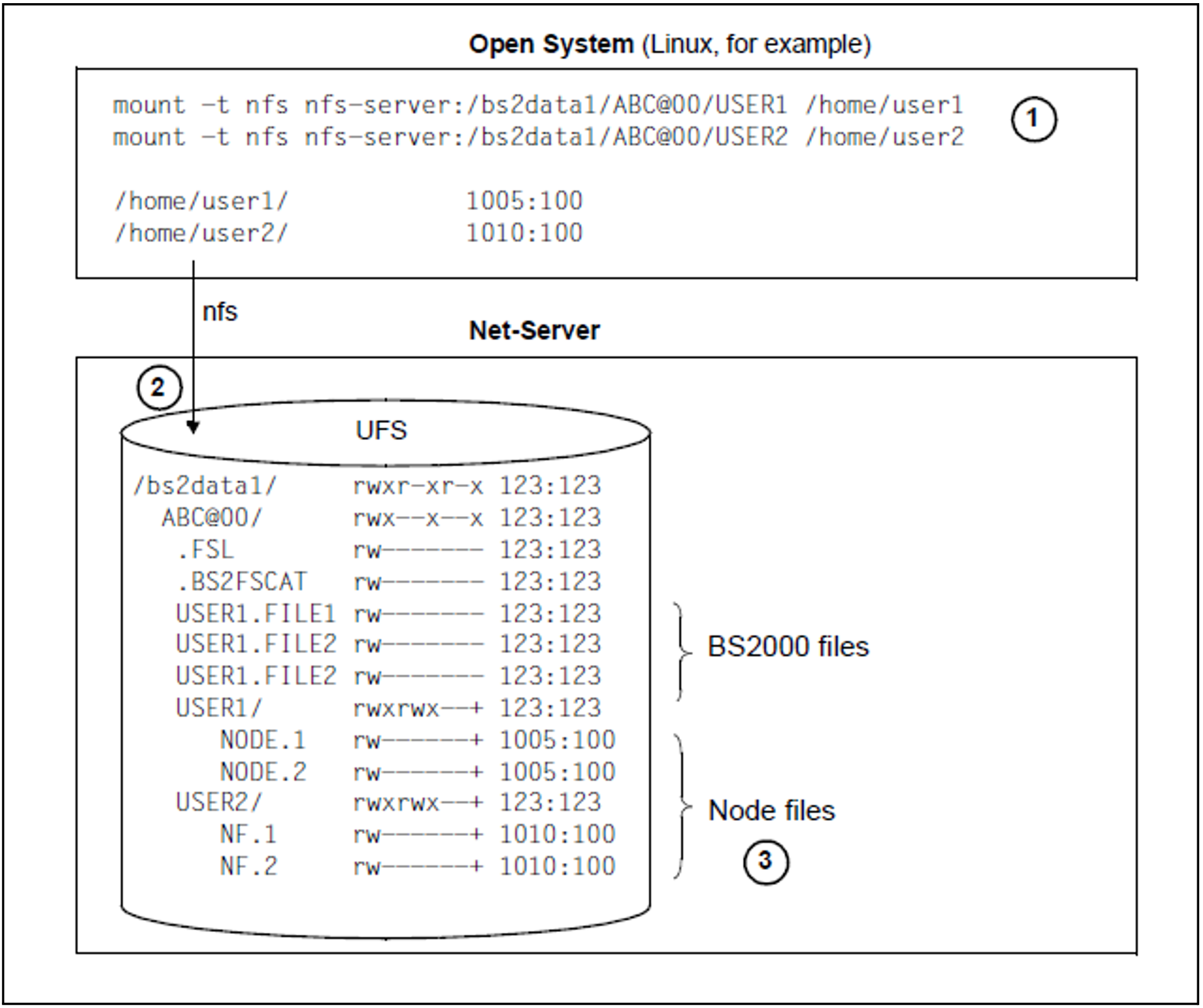 user1anduser2in the example above therefore obtain access to the directoriesUSER1andUSER2.To grant a user read and write access both from BS2000 and from the open system, the same UserId and GroupId must be entered for him/her on both systems. The same applies for creating and deleting files.