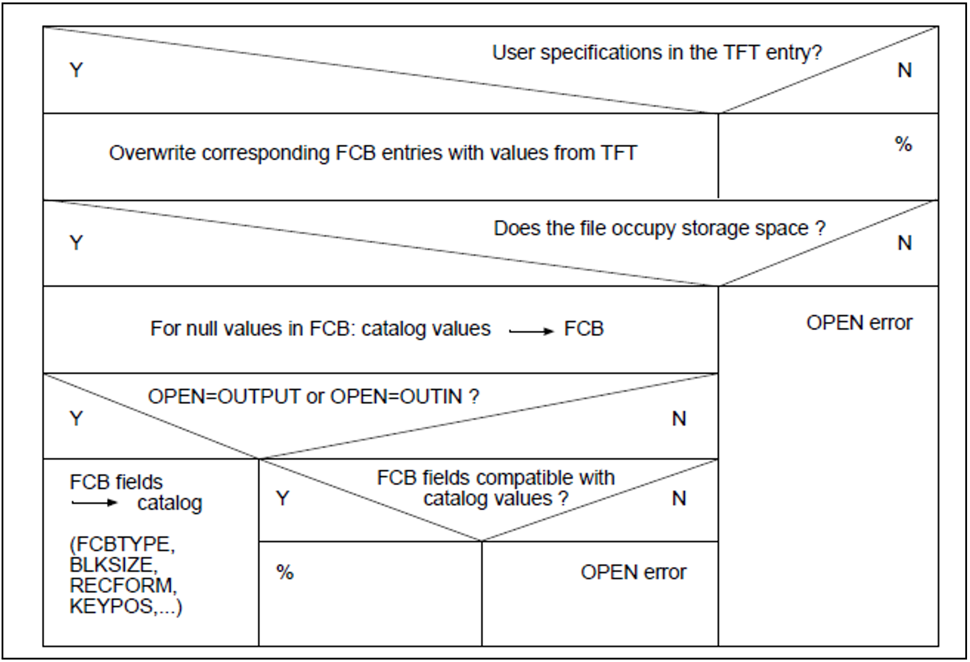 When the file is opened, specifications in the TFT entry override the corresponding fields in the file control block created by means of the FCB macro. Fields in the TFT entry which contain the value “*BY-CAT” or “*BY-CATALOG” (so-called “NULL operands”, see below) are treated specially.