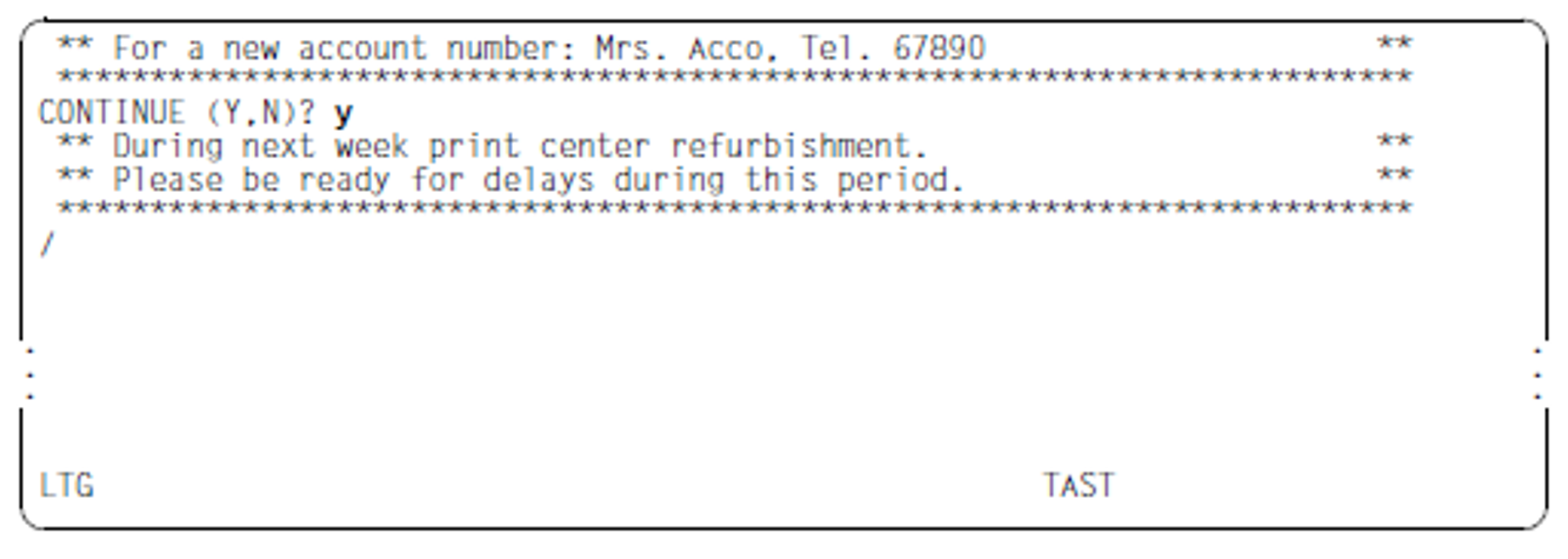 ** For a new account number: Mrs. Acco, Tel. 67890                     **