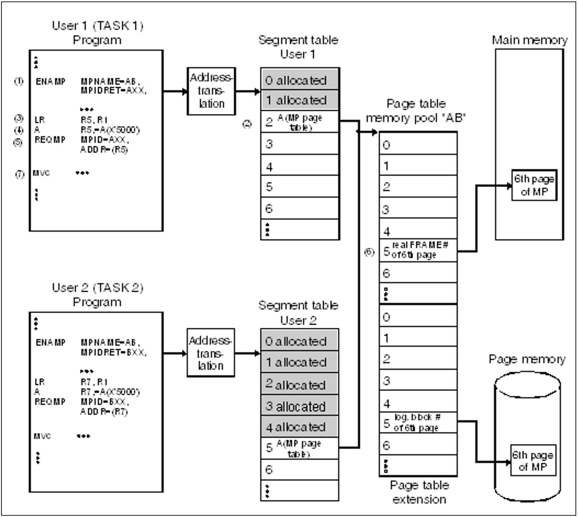 (6) | The 6th entry in the memory pool page table contains the real frame number of the 6th page of memory pool AB in main memory. The 6th entry in the page table extension contains the logical block number of the 6th page in page memory. |