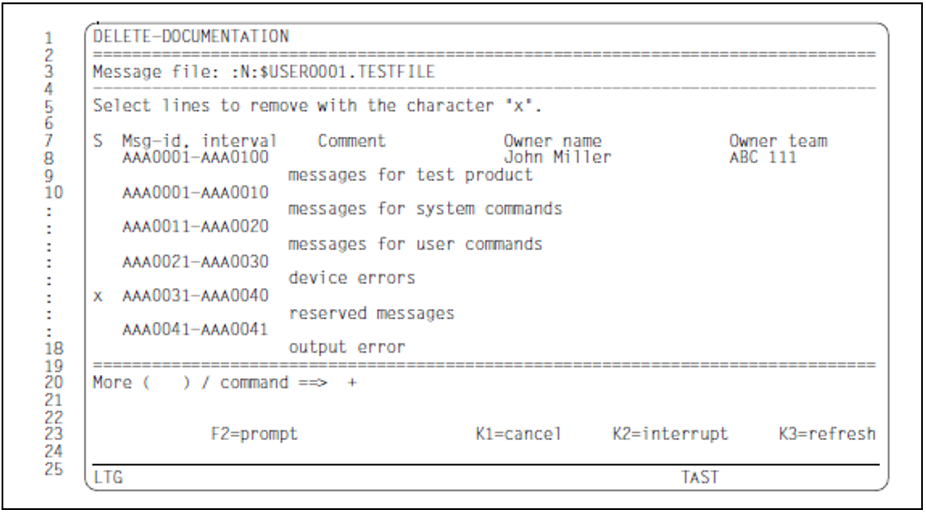 This mask allows documentation lines that were written for one or more message units to be deleted. Unlike the MODIFY-DOCUMENTATION mask, this mask only permits lines to be deleted that are marked with an “x” in the S column. The documentation lines themselves are overwrite-protected.