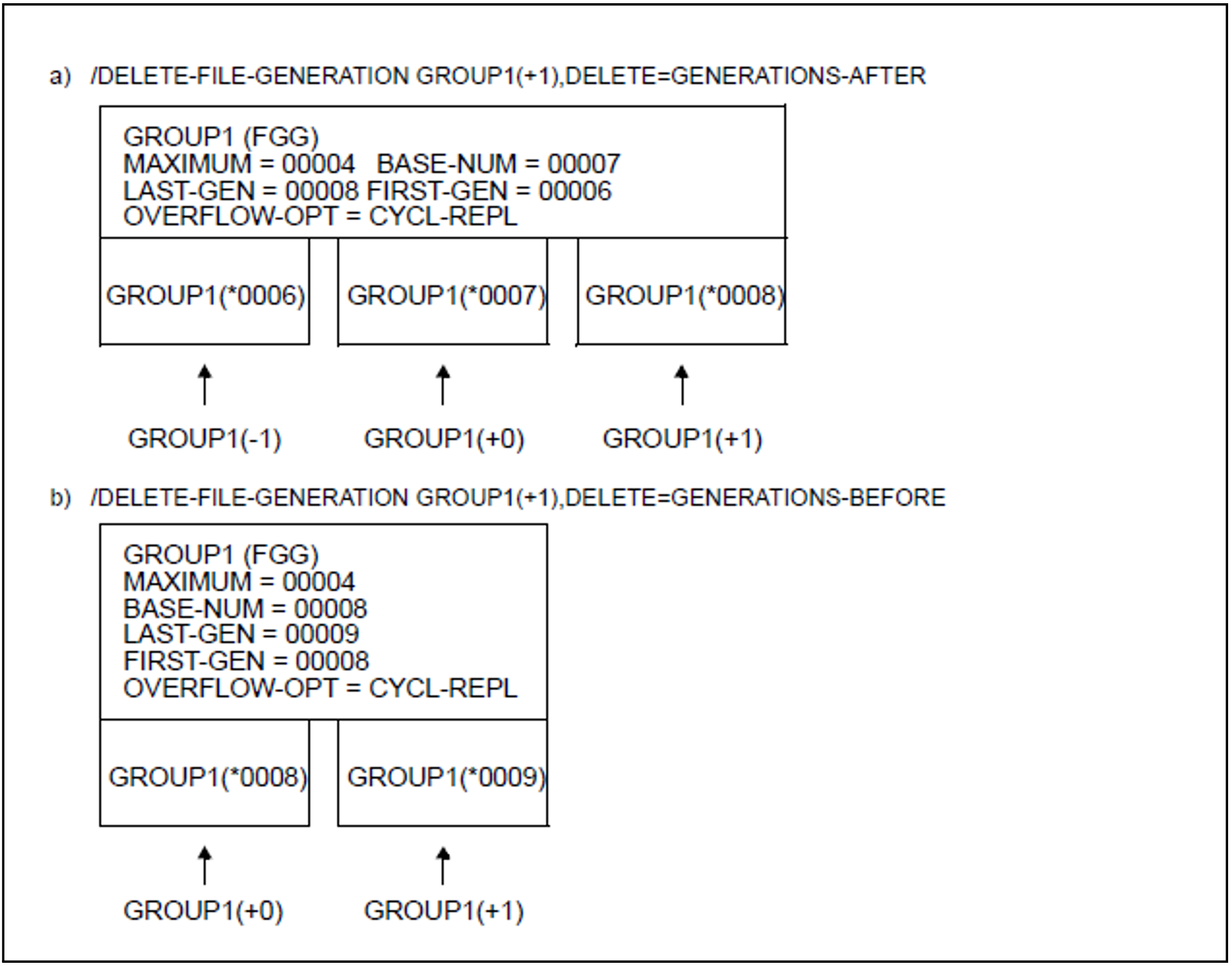 The user may also specify wildcards in the file name in the DELETE-FILE-GROUP command in order to erase several file generation groups at the same time.