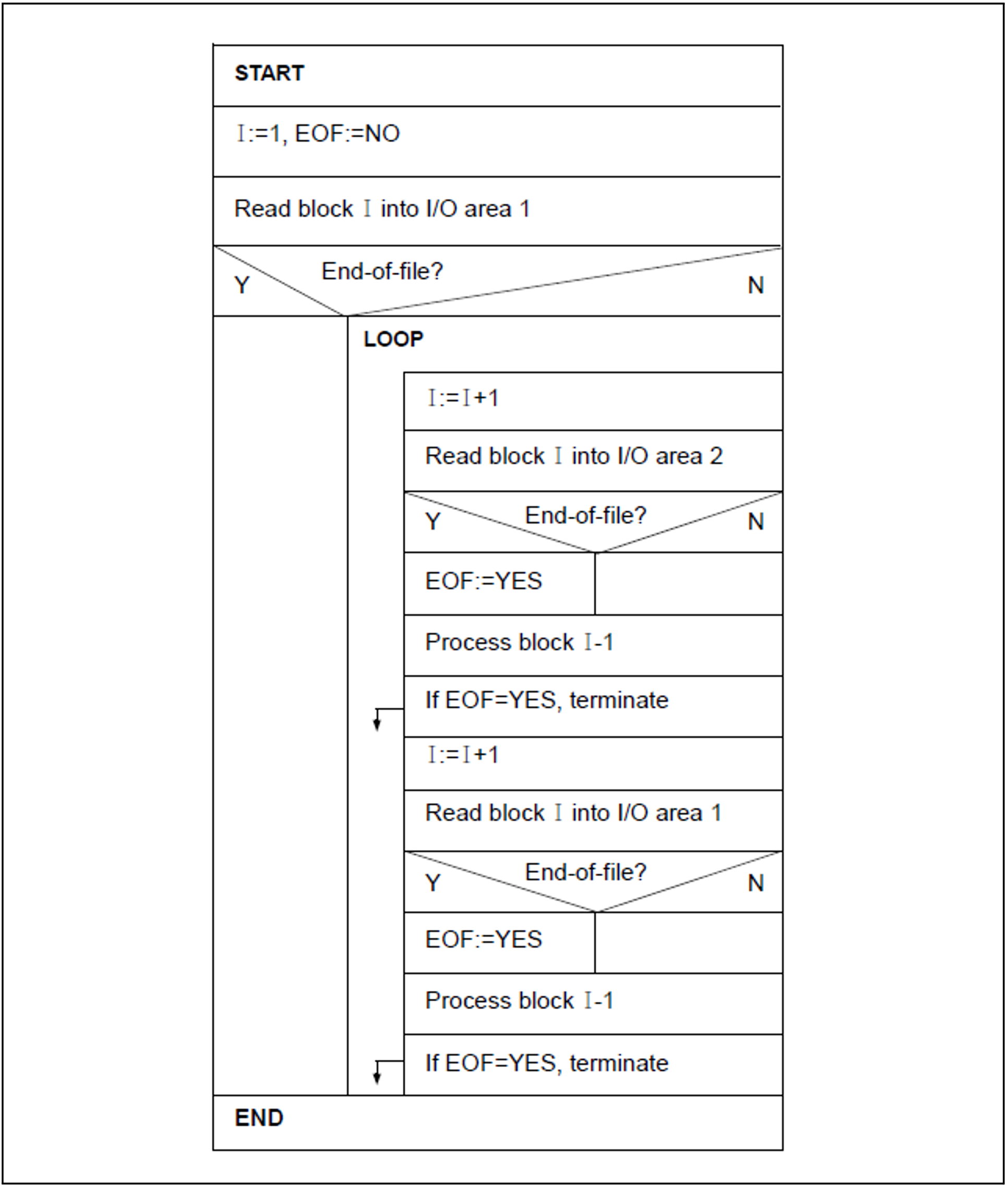 A reduction in processing time can be achieved by means of asynchronous I/O operations:Once an I/O operation has been initiated, control is immediately returned to the program in order to enable other processing to take place in parallel with the physical I/O. The next I/O operation is then initiated using a second I/O area that does not overlap the first, and so on. Figure 1 illustrates the overlapping of processing and input operations.
