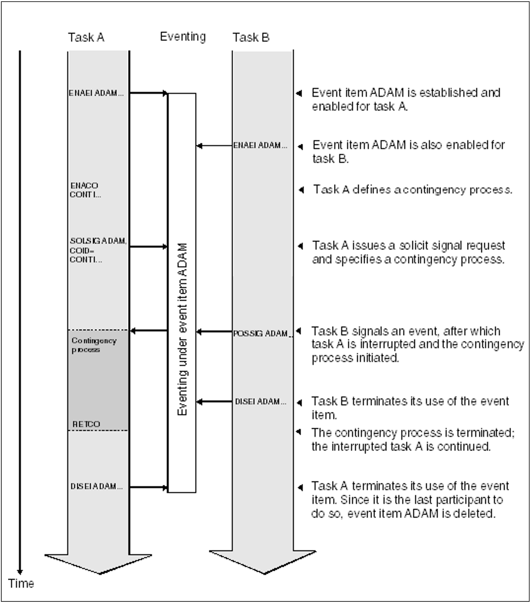 Eventing is a technique which makes it possible to coordinate the execution of two or more (user) programs in different tasks. For example, program B is to read data records from a file only after program A has updated it; or program A is to write a data record in a shared memory area only after program B has read the preceding record. Coordination of the programs is achieved by the use (for control purposes) of a common event variable to determine the actions of the operating system (to put a task into a wait state, to end the wait state, or to start a contingency process). The event variable is addressed via the event item. The entire procedure - posting of events, their interrogation and the consequent actions taken - is referred to as eventing. The external representation of eventing is the event item.