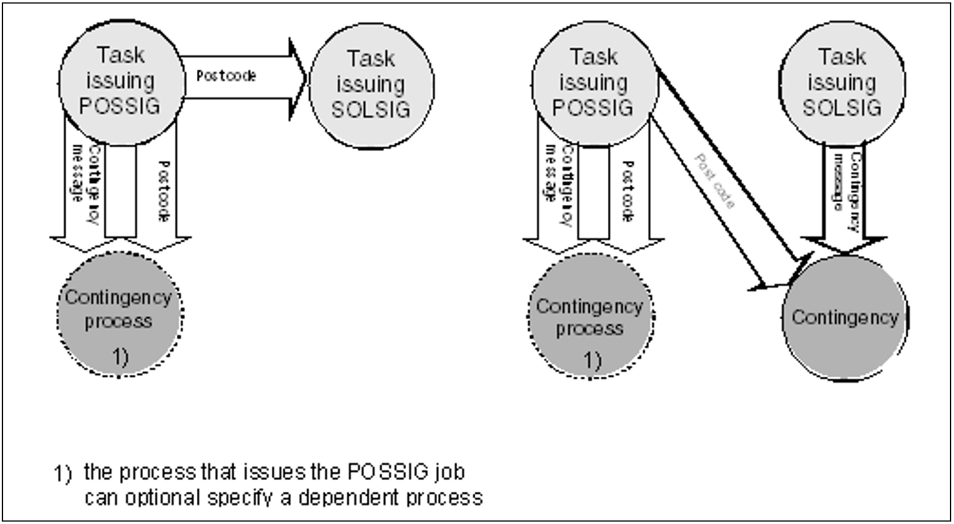 The POSSIG call may also specify a contingency message, which will be passed to the contingency routine in register R1 after it has started.Several consecutive POSSIG calls may be chained together. The chain may also terminate with the macro SOLSIG.