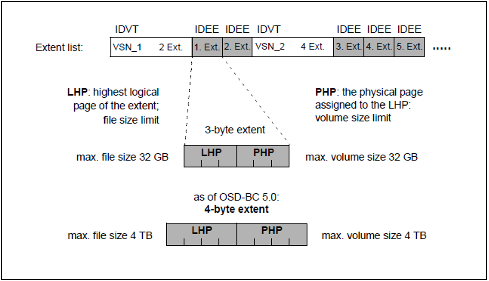 BS2000 supports files and pubsets with a capacity of up to 4 TB and volumes of up to 2 TB. These are called “large files”, “large pubsets” and “large volumes”.