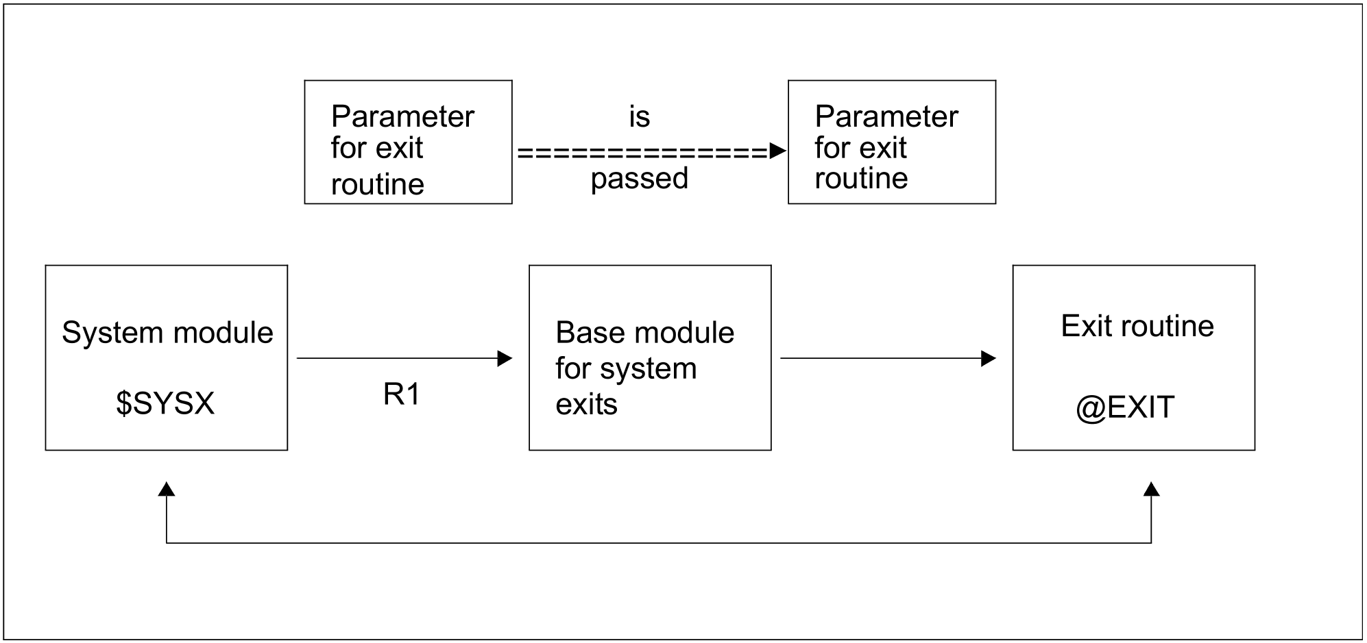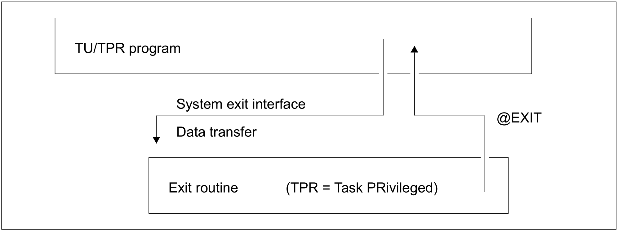 Via a TU or TPR macro interface, a module containing an exit point can branch to the corresponding exit routine, provided the routine exists and has been activated. Depending on what is required, this exit routine can check and (if necessary) modify the data, and it can reject or log a request. Control is then returned to the calling system module by means of the @EXIT macro in the program manager environment (DSL environment) or via BR R14 in pure Assembler routines. New exit routines should be developed in the DSL environment wherever possible.