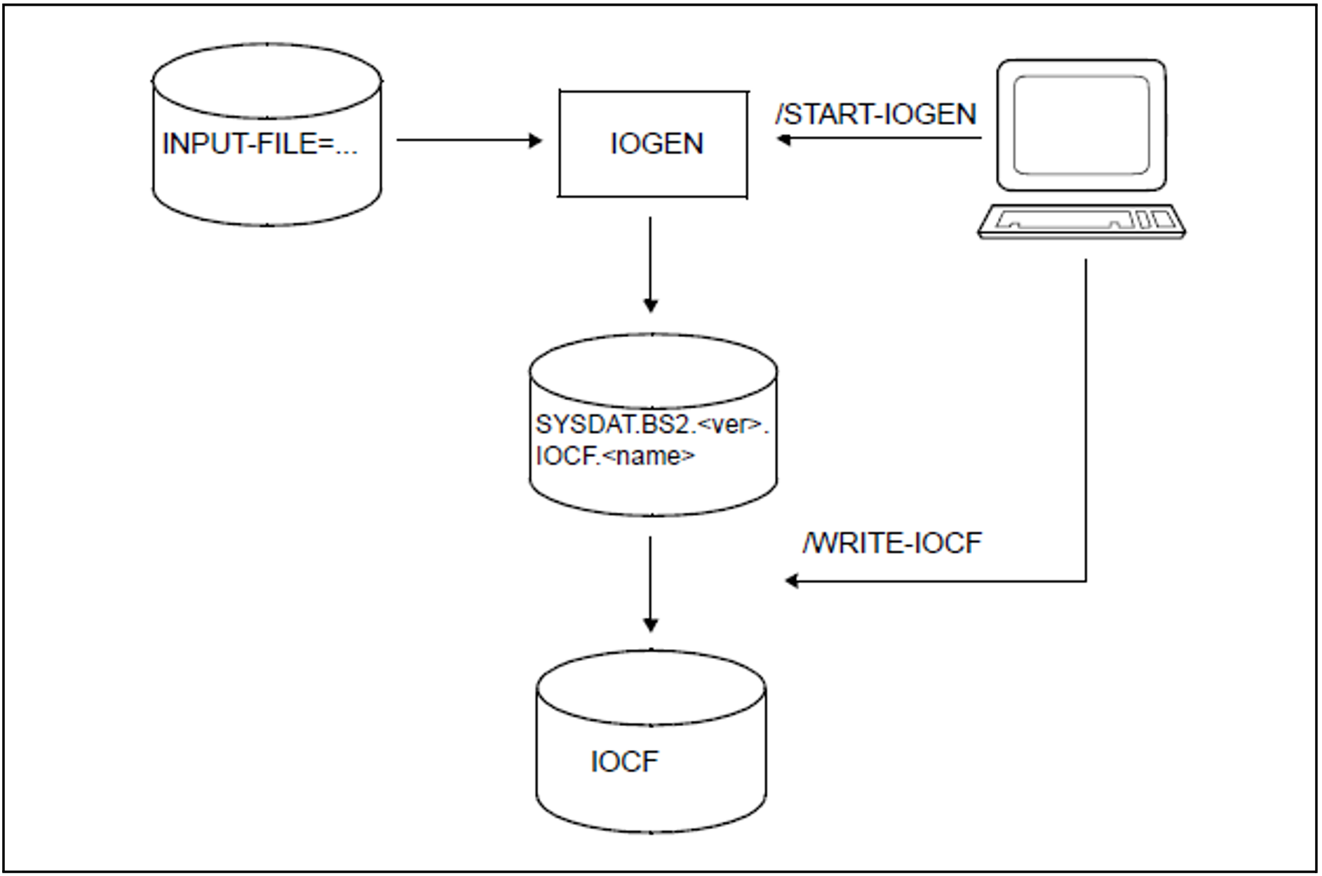 After the successful IOGEN run, IOGEN generates the IOCF file SYSDAT.BS2.<ver>.IOCF[.<name>] directly with the configuration data of the channel peripherals.
