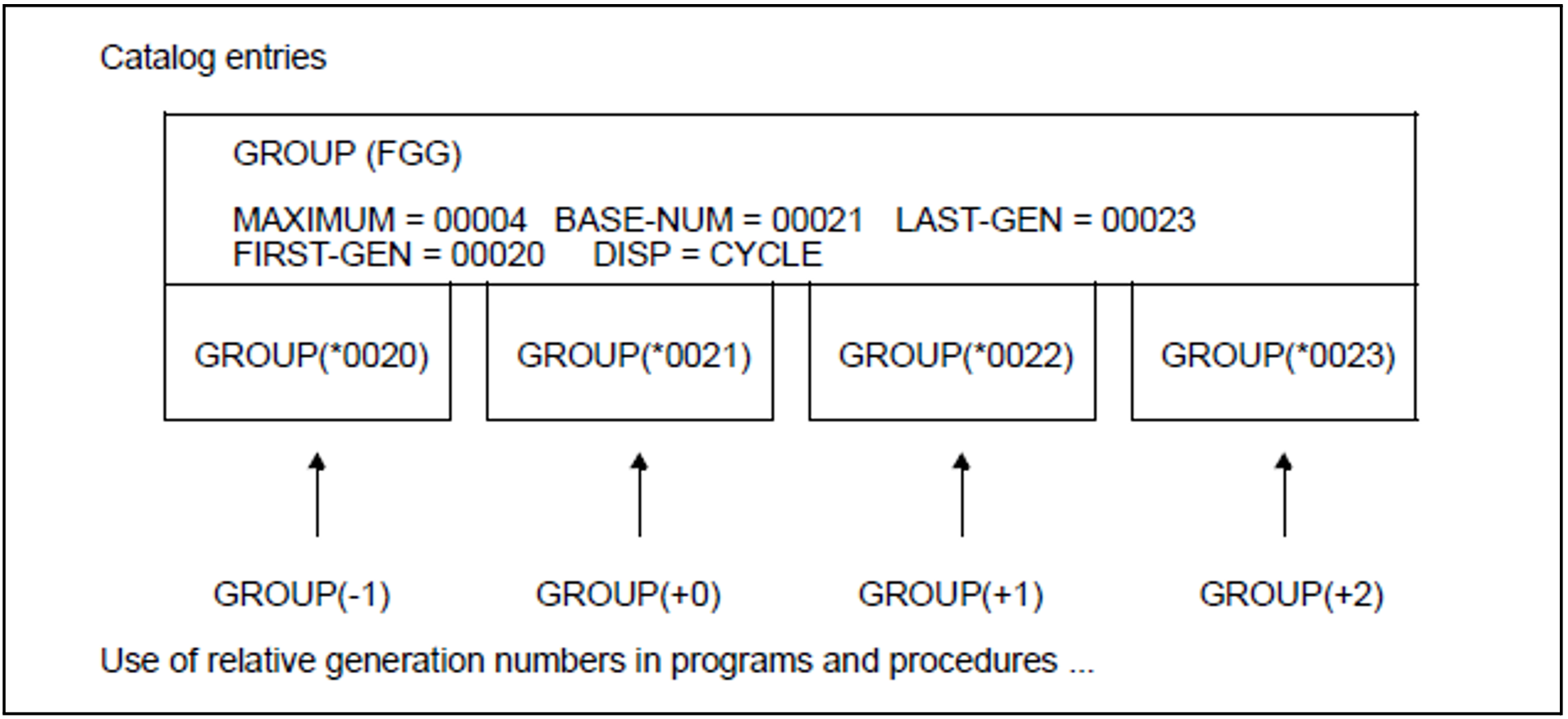 In order to avoid the need to update the absolute generation number in programs or procedures which process or create file generations, a base for the use of relative generation numbers is defined in the catalog entry for the file generation group. The user may specify any existing generation as the base for relative indexing and may change this base at any time by means of the BASE operand of the CATAL macro or the BASE-NUMBER operand of the CREATE-FILE-GROUP and MODIFY-FILE-GROUP-ATTRIBUTES commands. The absolute generation number which is the current reference point is stored in the field “BASE-NUM” of the group entry in the catalog. DMS recognizes relative generation numbers by the fact that they start with the sign “+” or “-” instead of the asterisk “*” used for an absolute generation number.