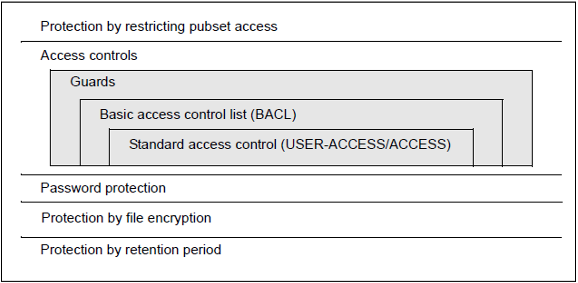 If Guards protection is not defined for an object but a BACL is, then the protection settings specified in the BACL apply. The ACCESS and USER-ACCESS protection attributes are ignored.Standard access control (USER-ACCESS/SHARE and ACCESS)