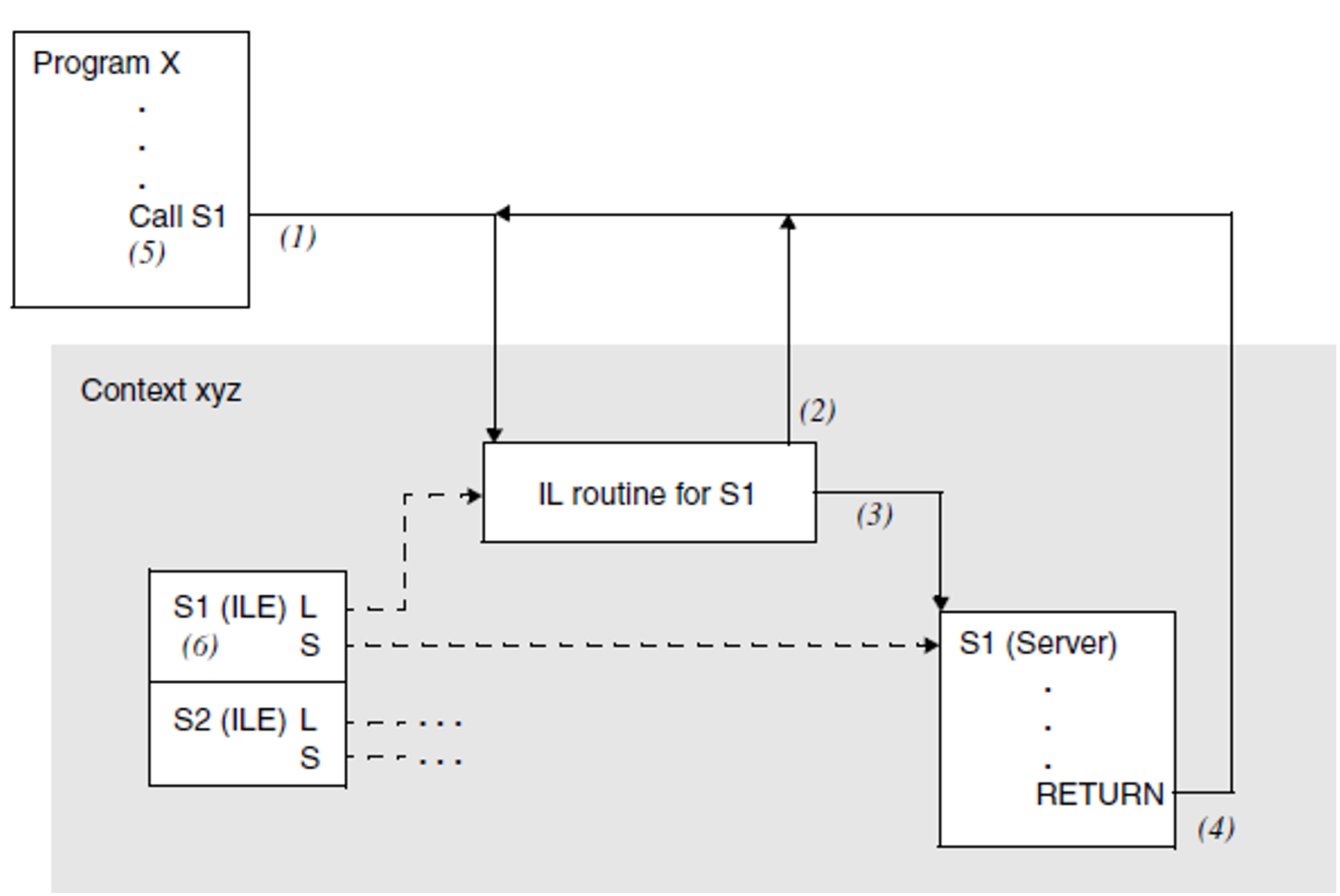(6) | The symbol table of the context xyz contains an entry for an ILE symbol named S1, in which the addresses of the IL routine (L) and the server module (S) are stored. |