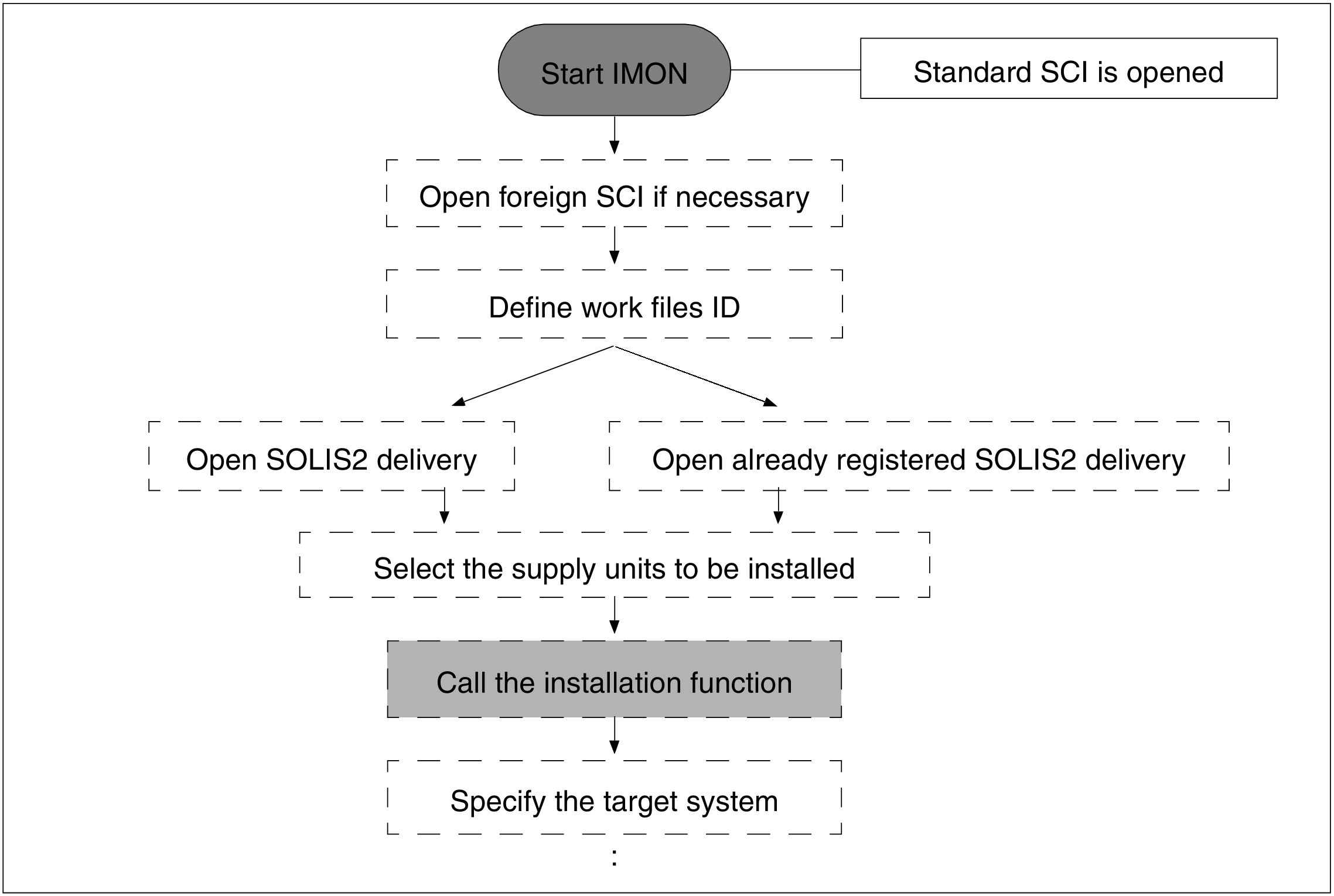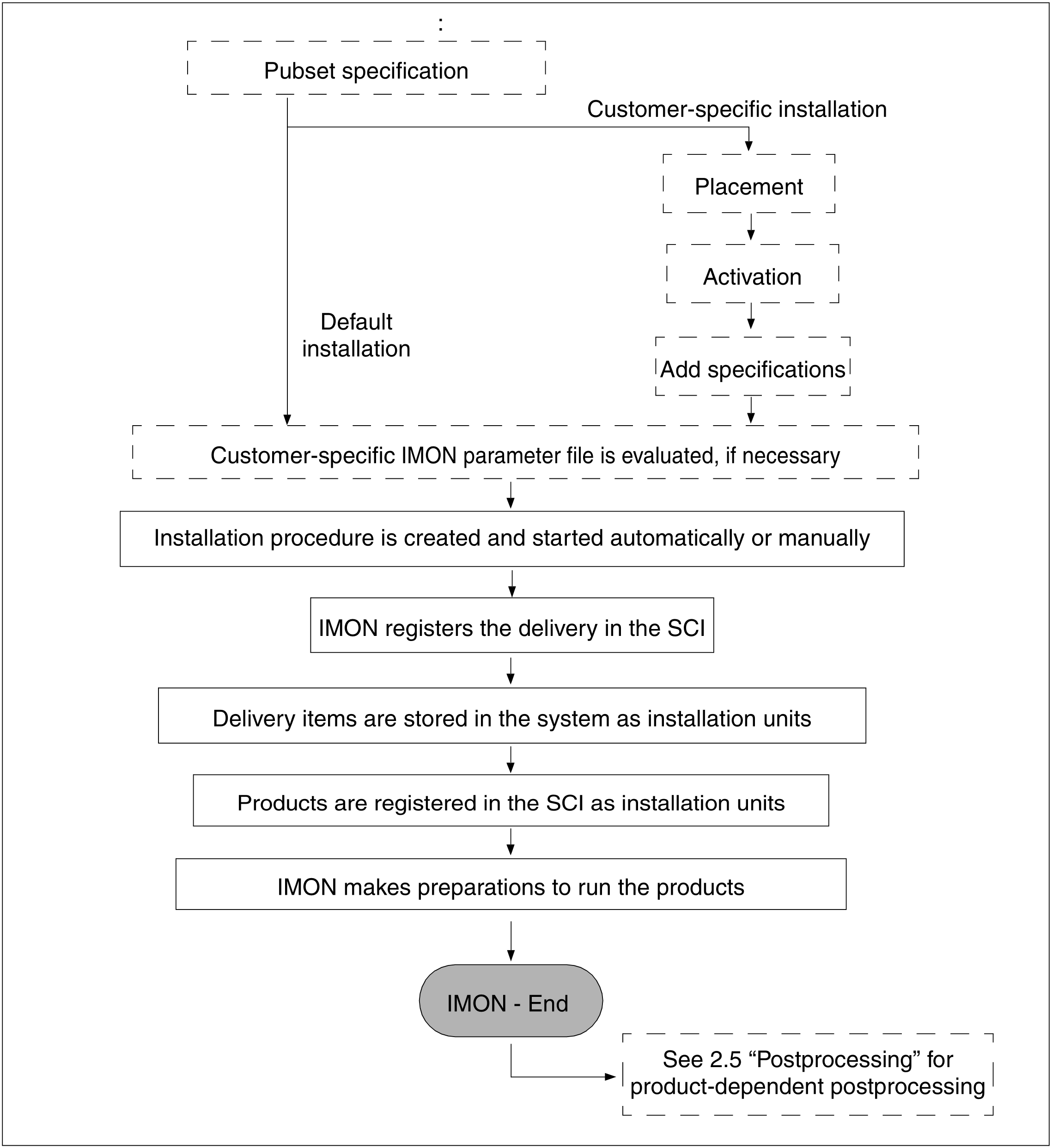 The actual installation procedure is executed once the generated procedure is started. Only then are the supplied files transferred to their depot location in the system from the distribution medium or the park ID (or from the installation ID in the event of multiple installation of a product already installed). The preparatory measures for running the product are also made by IMON.