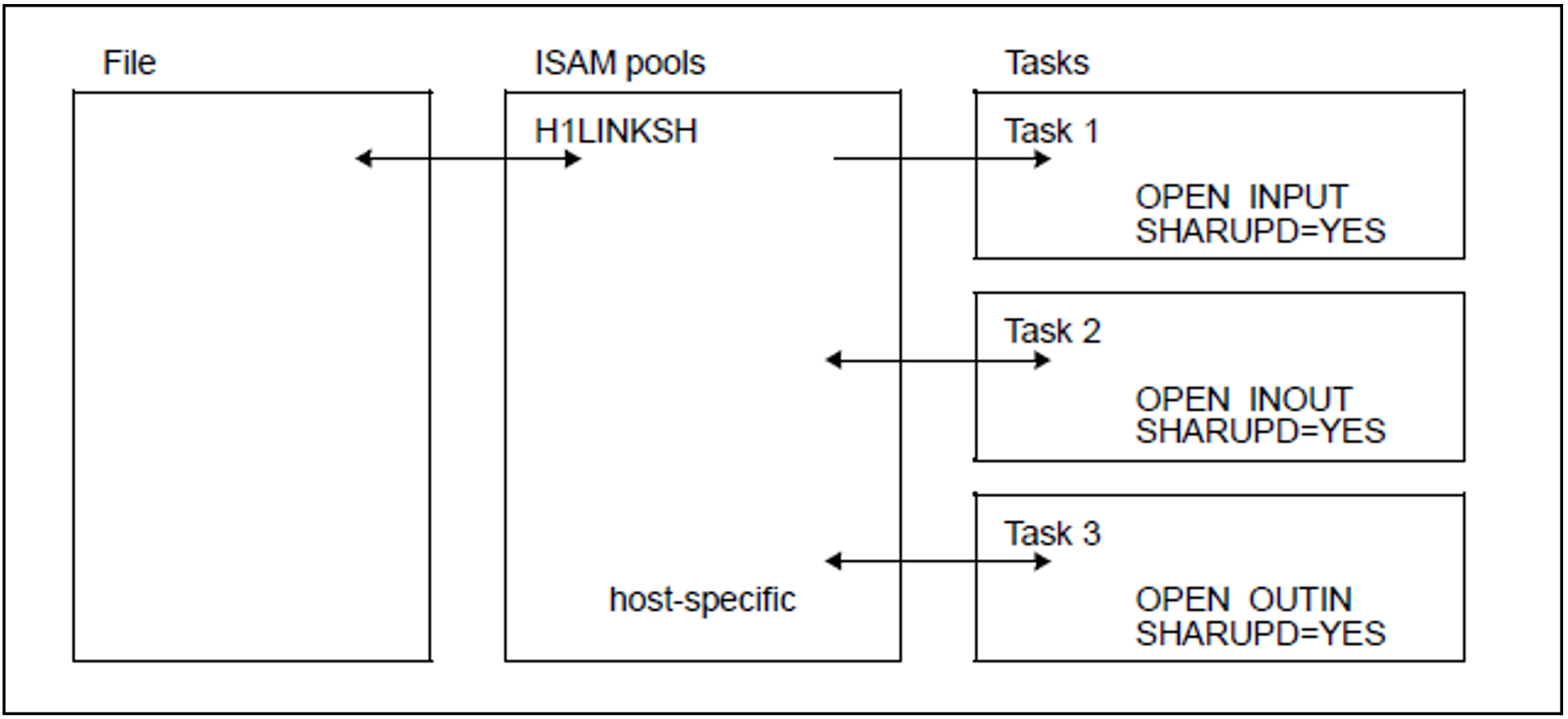A file is to be opened concurrently by several jobs and updated by at least one of these jobs: it must be processed in an ISAM pool which is not task-specific, and must be opened with SHARUPD=YES in all participating jobs. If a user-specific ISAM pool is involved, all tasks must run under the same user ID.
