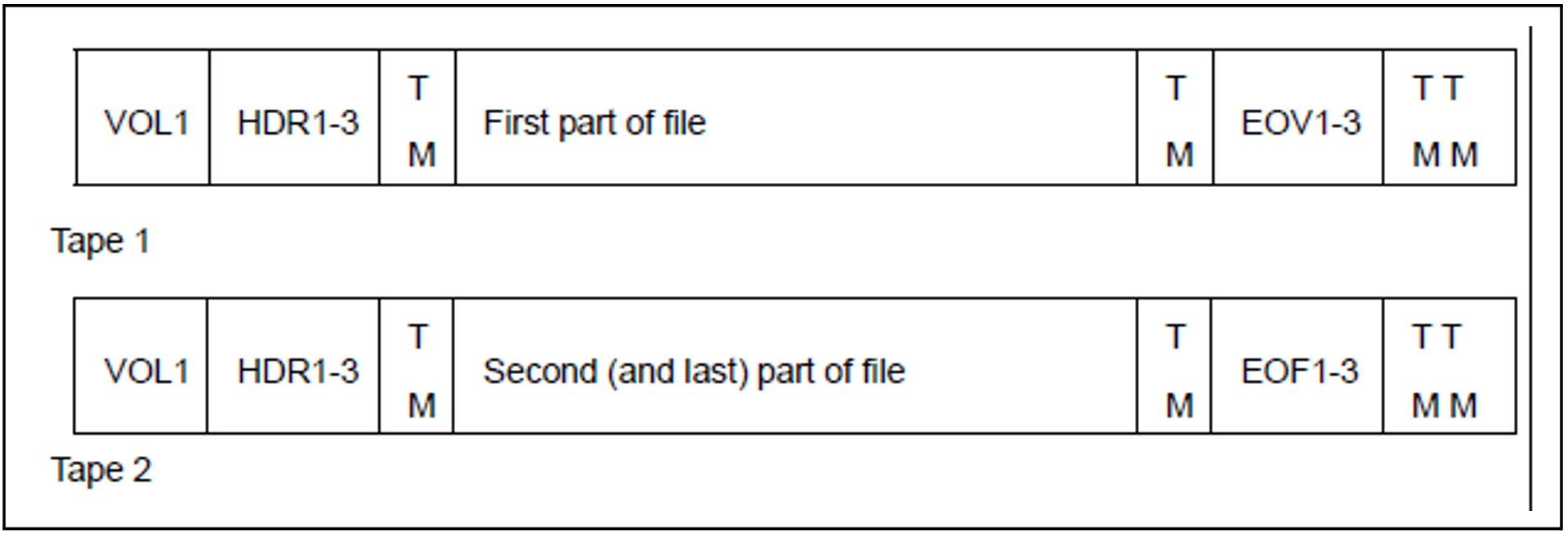 For multivolume files with standard labels, each tape begins with the VOL1 label, followed by the HDR labels and a tape mark. Then comes the first section of the file, terminated by a further tape mark. Instead of the EOF labels, EOV labels indicate the end of the tape and are written automatically by the system when a tape swap is performed.
