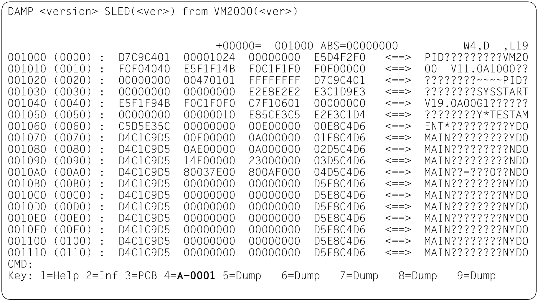 An area with absolute addresses can be output in a dump window. This is done by entering the keyword ABS in the “ASEL” input field in the header line of a dump window and the required address in the “Absolute address” input field.