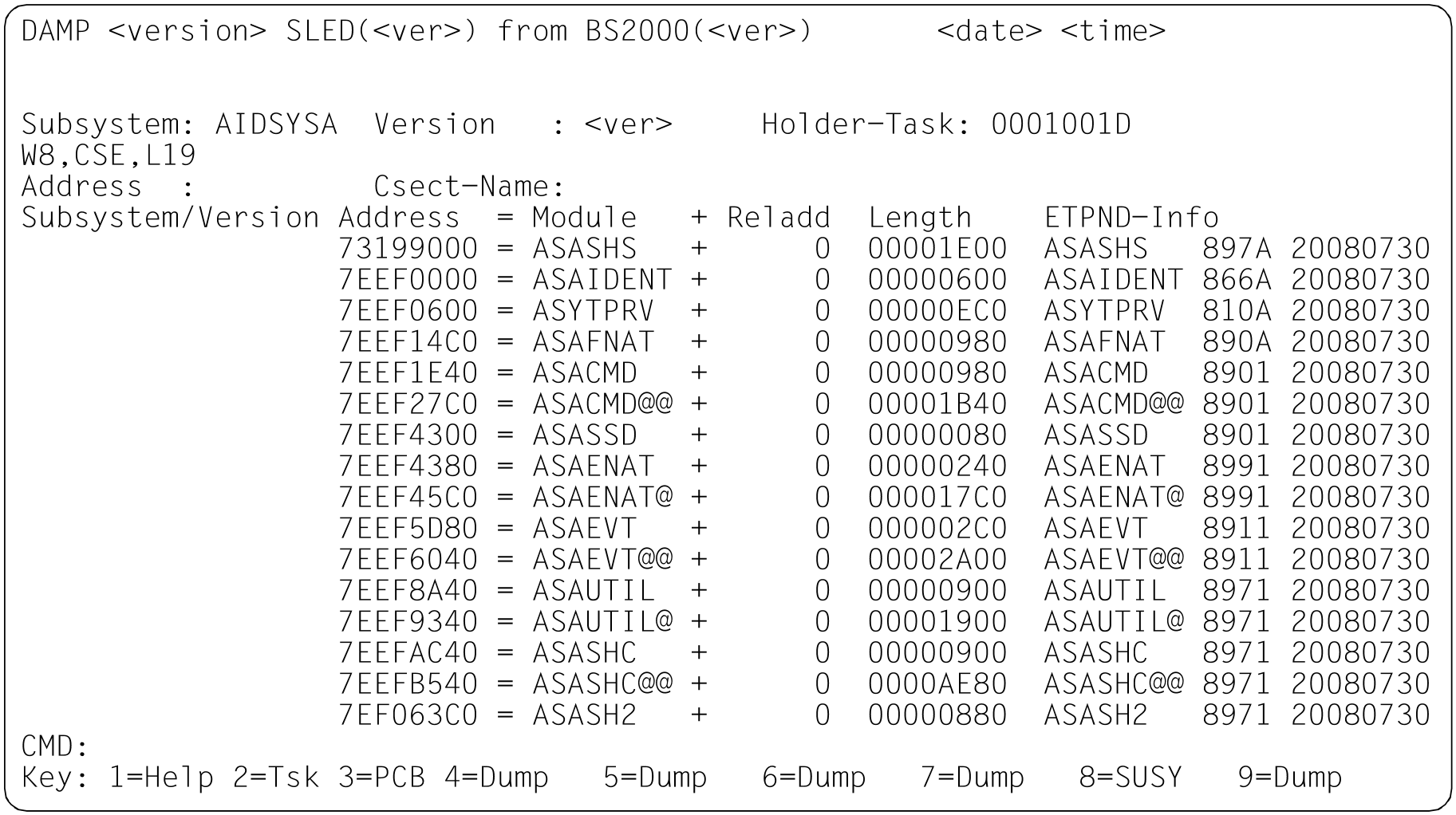 contains the ETPND information with the module name, version number and thecompilation date.In the case of prelinked modules, the module length may be zero. In system, user or area dumps, the ETPND information may be missing if the associated virtual page is not contained in the diagnosis object, since the dump generator only stores the referenced code pages.