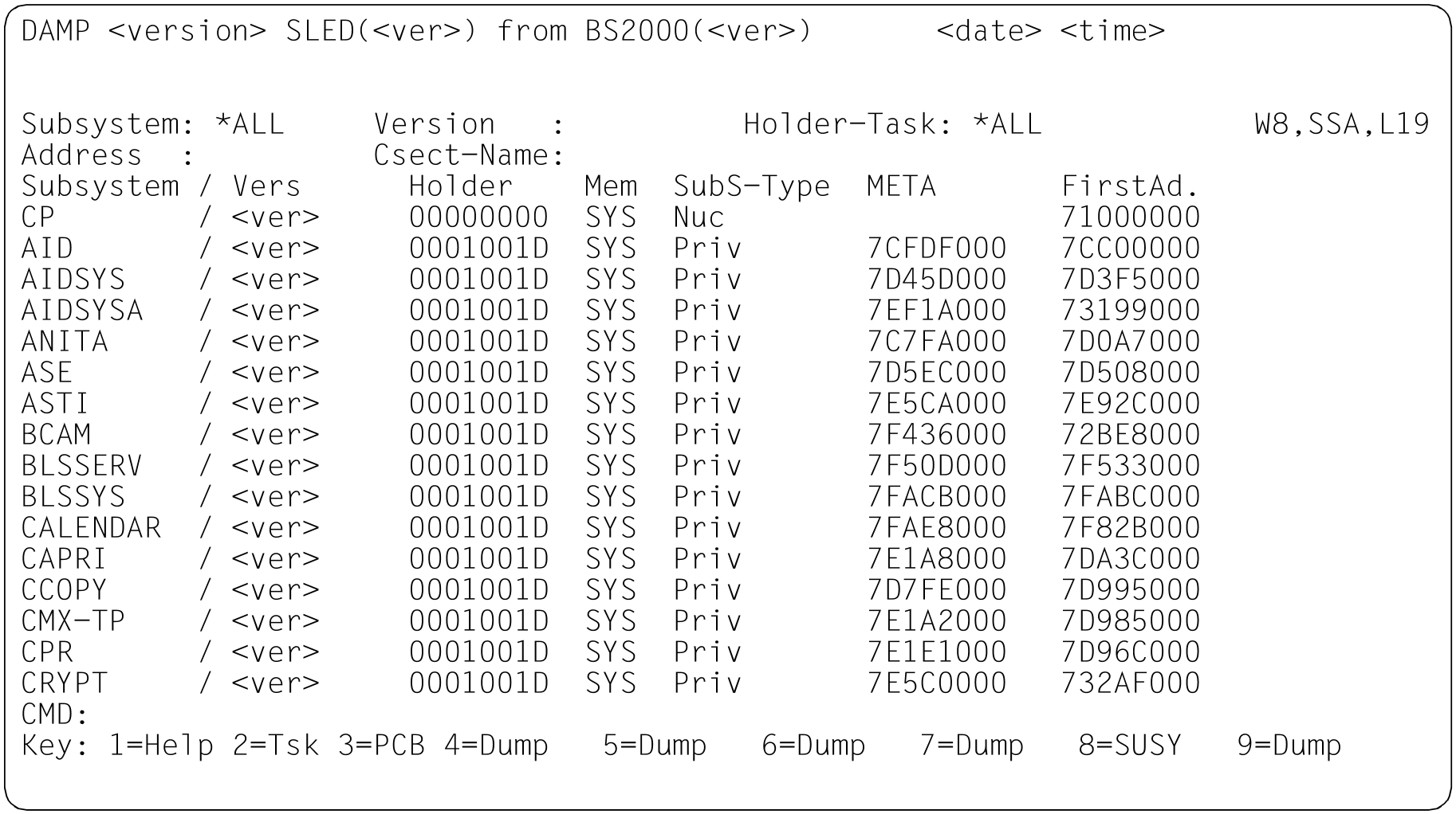 LST The entire subsystem and CSECT information of the object is output to the current EDT area. The current task (in the SLED or SNAP) is the last task selected by the person performing the diagnosis (by marking an item in window W2 or by explicitly entering a TID or TSN etc.).