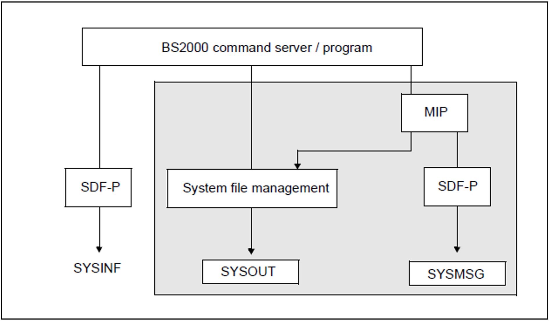 The figure below shows both the output to SYSOUT by the system file manager and the diversion of the output information to the S variable streams SYSMSG (and SYSINF) controlled by SDF-P. Further information on SYSINF can be found in the “Commands” manual [27].