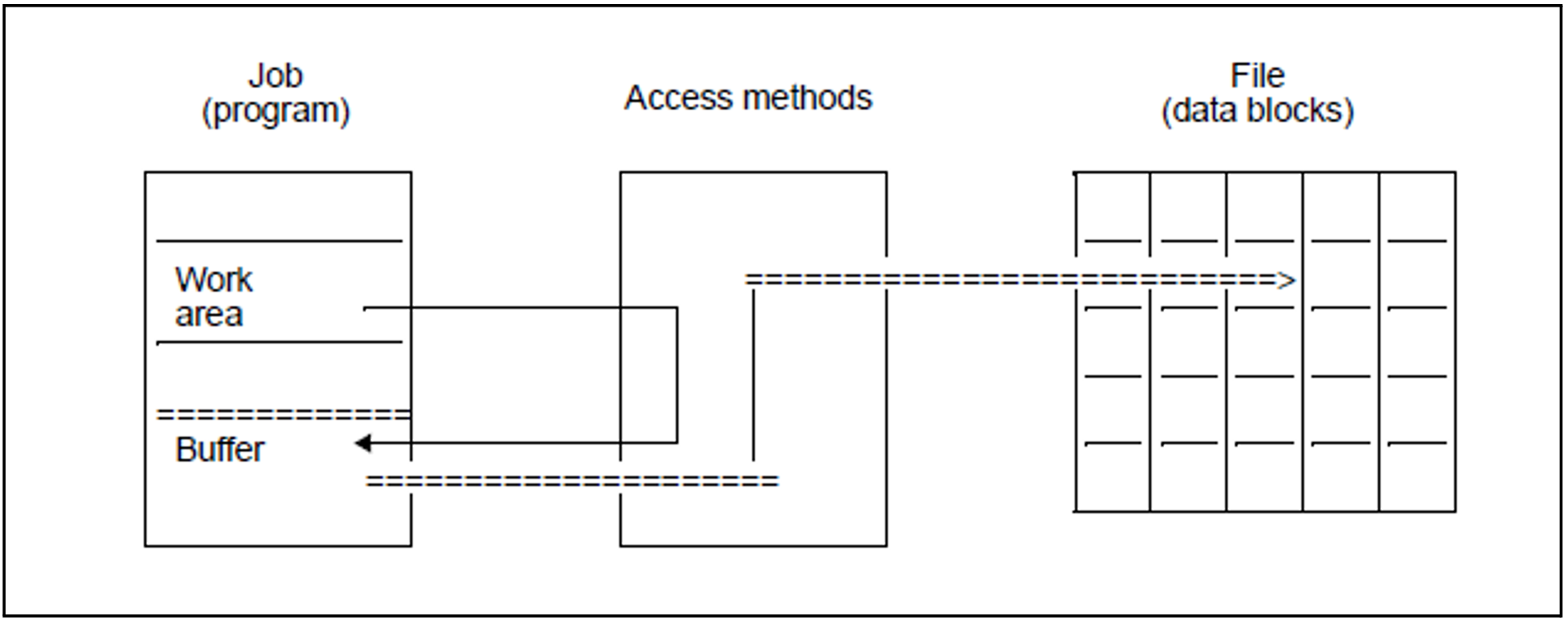 The basis of file processing is the record. However, data blocks are still transferred between the peripheral device and the buffer area. DMS handles the necessary blocking and deblocking of records and makes the required records available to the user program. If the record required by a read operation is not in the buffer, or if a write operation fails because the buffer is full, a data transfer is initiated: DMS reads the next data block or writes the buffer contents as a new data block, respectively.