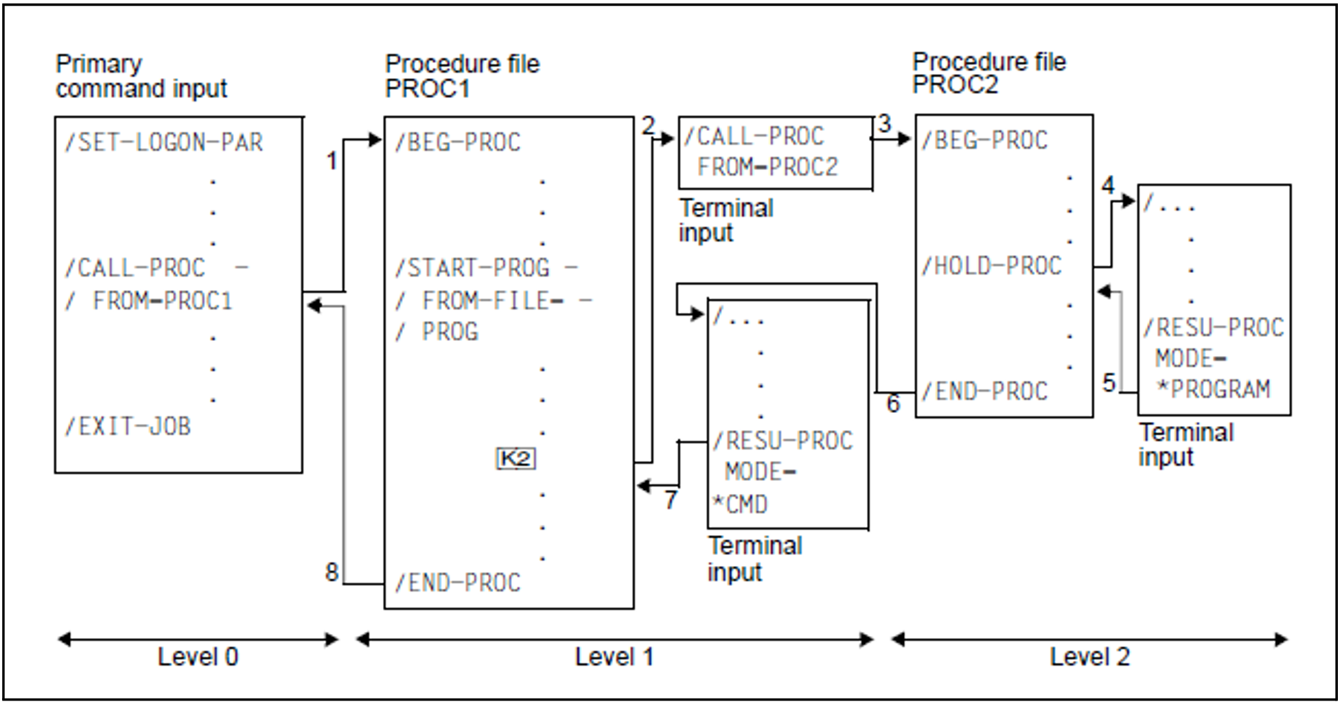 The program PROG interrupted by [K2] is continued at procedure level 2. The logical system files of procedure level 2 are now assigned to the program. If the program run terminates at this procedure level (last instruction executed), control is passed to the procedure PROC2. Processing is continued with the command following the HOLD-PROCEDURE command.